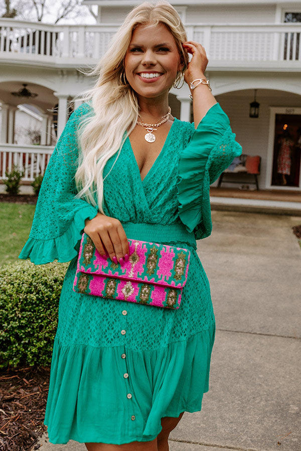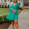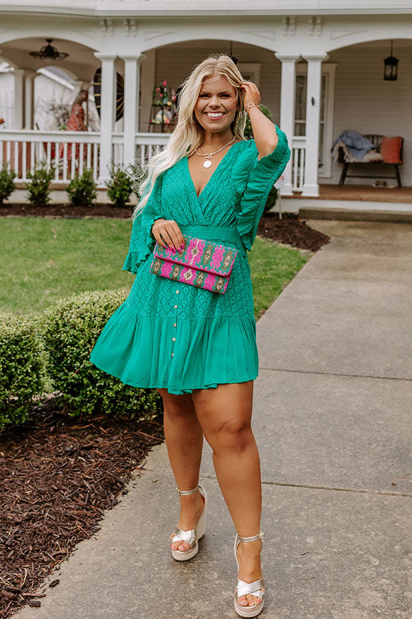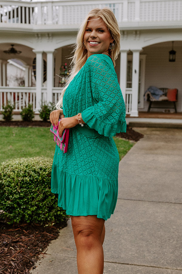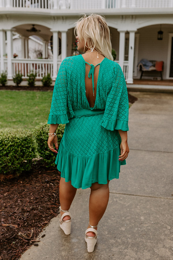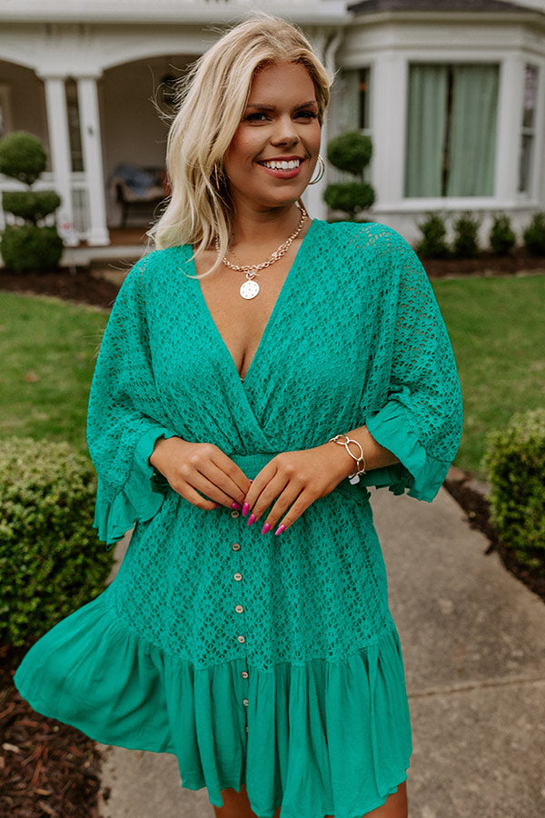You are sure to look like a spring beauty when you wear this darling kelly green plus size romper featuring lightweight lace material, a faux wrap bodice, a v-cut neckline and upper back with a tie closure, loose 3/4-length sleeves, a cinched waistline, a button down front, and a relaxed shorts silhouette that ends in straight ruffled upper-thigh length hemlines! on products Measurements