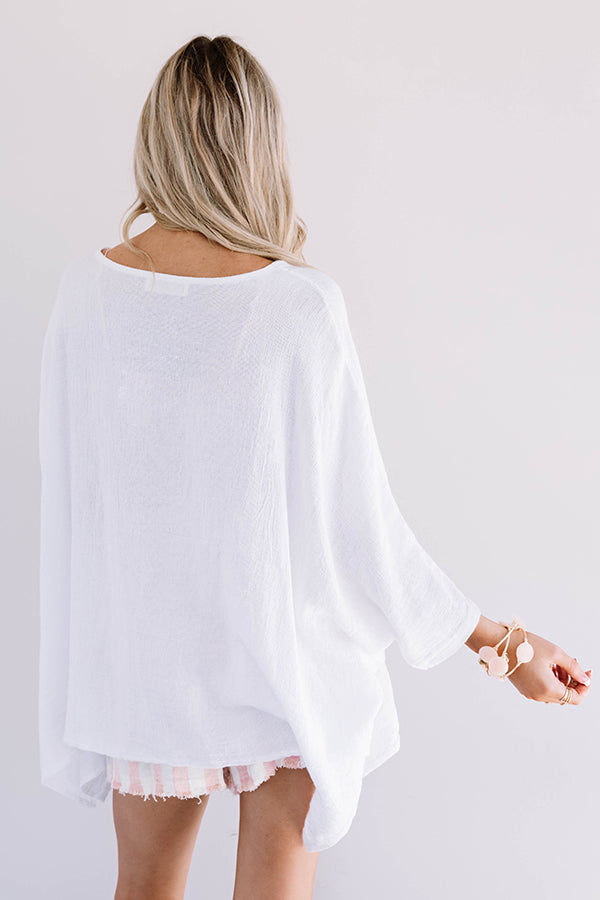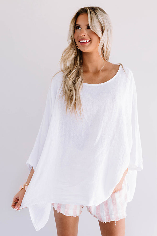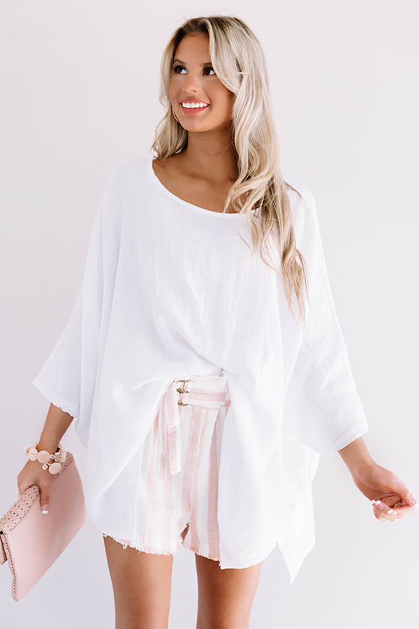 This chic white top is sure to blow in the "island breeze" with its lightweight linen material, a wide scooped neckline, loose 3/4-length sleeves, and an ultra relaxed silhouette that falls into an uneven tunic-length hemline! You can style this casual cutie a variety of ways, like front tucked into some blush striped shorts, neutral wedges, and a matching clutch, but you can also wear it with some distressed light wash flares, "The Melina Faux Leather Heel in White," and our "Glimps Of Gorgeous Embellished Headband in Sky Blue!" Measurements