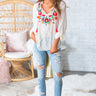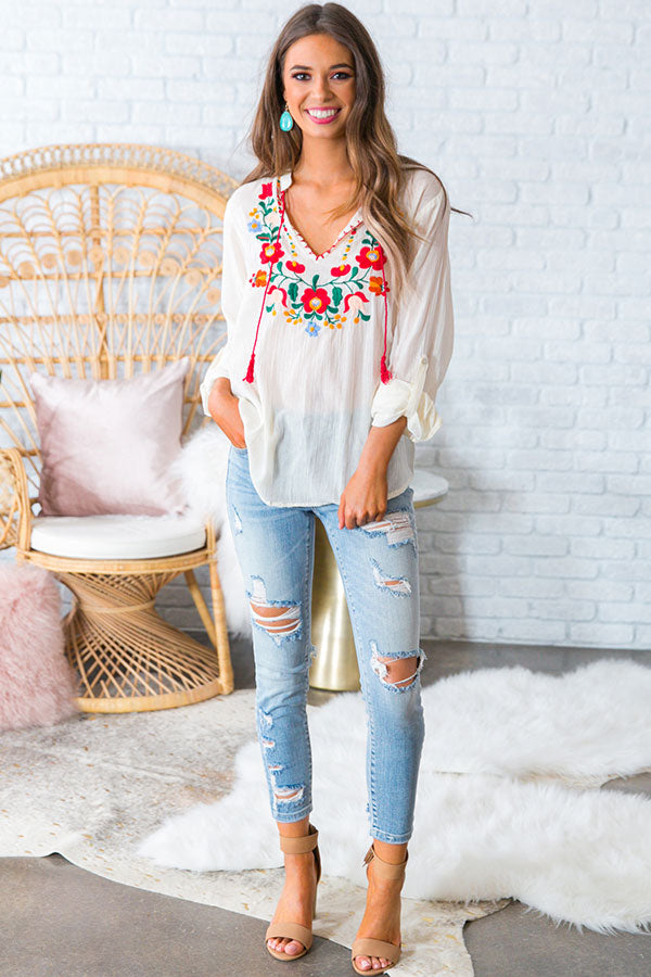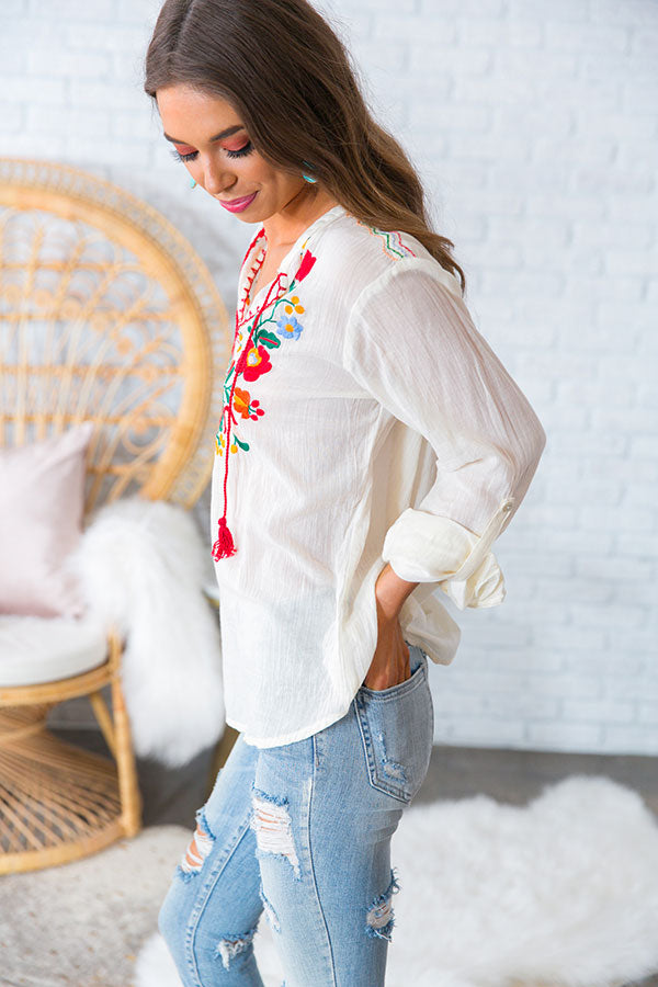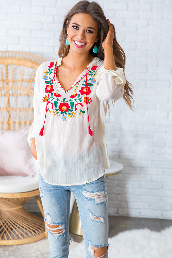This boho beauty is easy, breezy & beautiful! The "Island Life Embroidered Top" has a vibrant floral embroidered v-neckline with decorative tasseled ties, zig-zag stitched shoulders, long roll-tab sleeves & a breezy woven silhouette.