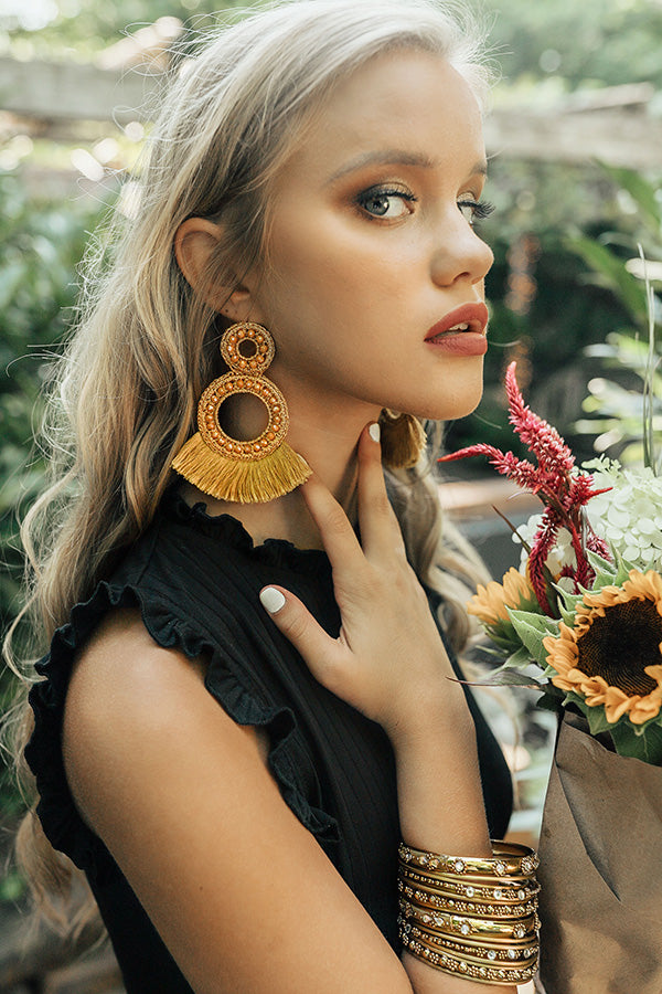 Razzle-dazzle the style game when you wear the "Island Luxe Earrings" featuring small open circle studs and larger beaded hoops adorned with mustard tassel fans!
