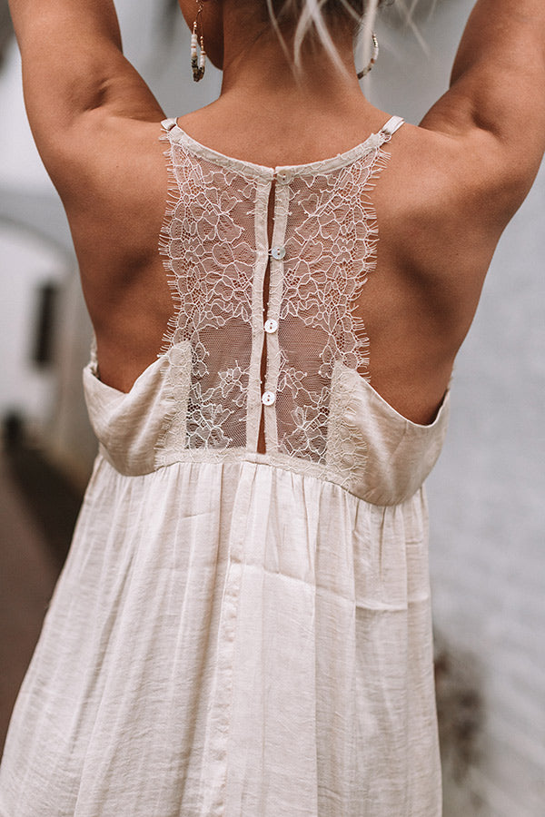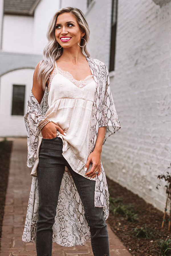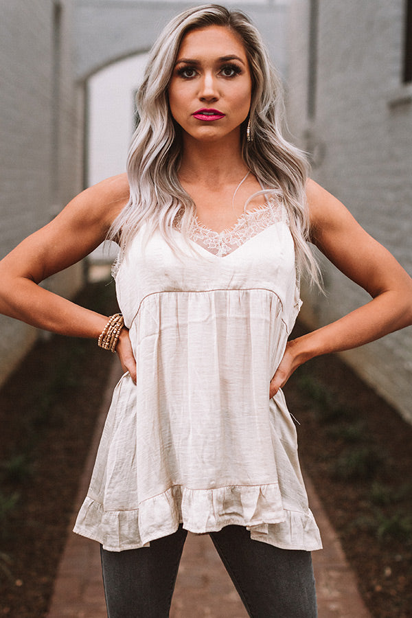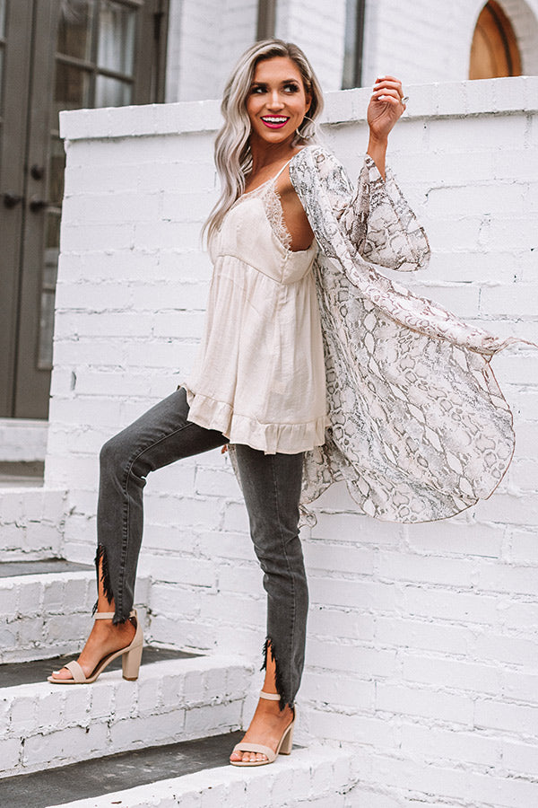 Our dainty champagne colored "Island Obsession" shift tank features ultra lightweight material, intricate lace detailing on the trim and four button up closure racerback, a v-cut neckline with adjustable spaghetti straps,, and an ultra relaxed silhouette that falls into an uneven tunic length ruffled hemline! This upscale basic can be styled a variety of ways, like layered under a snake print duster with some grey pants and neutral heels, but you can also wear it with some frayed denim shorts, "The Brighton Espadrille in Grey," our "Music City Snake Print Hair Scarf," and our "Neutral Territory Snake Print Tote in Black!" Measurements
