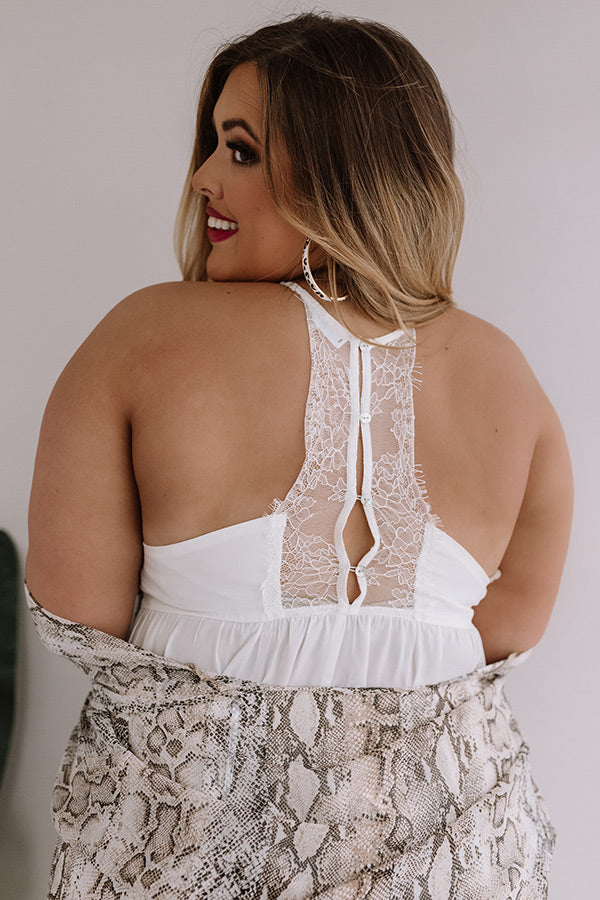 Plus Size - Our dainty white "Island Obsession" shift tank features ultra lightweight material, intricate lace detailing on the trim and four button up closure racerback, a v-cut neckline with adjustable spaghetti straps,, and an ultra relaxed silhouette that falls into an uneven tunic length ruffled hemline! This upscale basic can be styled a variety of ways, like layered under a snake print duster with some distressed skinnies, neutral wedges, and a brown fringe crossbody, but you can also wear it solo with some black flares, our "Tour De Chic Gingham Hat in Black," and "The Kamryn Stripe Sandal in Black!"
