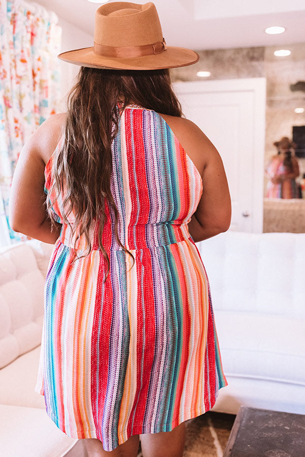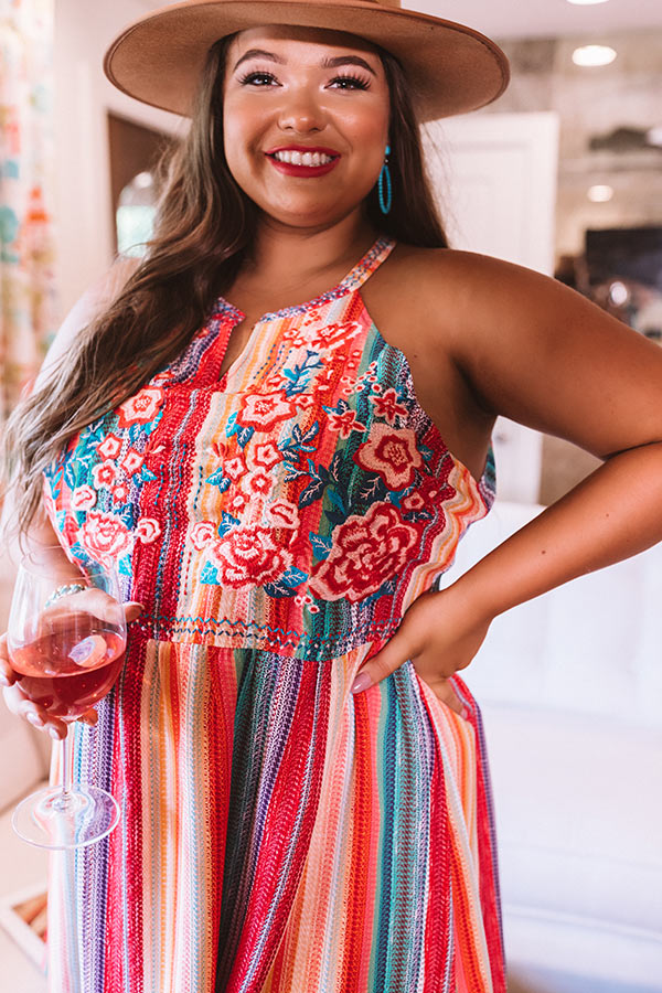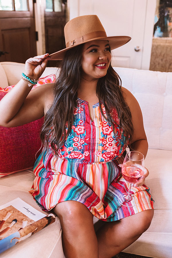 Plus Size - We guarantee you won't want to overlook this stunning shift dress featuring lightweight breezy material patterned with horizontal colorful accent stripes and intricate embroidered detailing on the bodice, a rounded neckline with a v-notch, 1-inch sleeveless shoulder straps with a racerback fit, and a relaxed skirt silhouette that falls into a straight mid-thigh length hemline! We have styled this unique piece with a brown block heel and faux suede hat, but you can also wear it with our "Stylish By Design Woven Clutch in Ocean Blue" and "The Rosella Wedge in Mustard!" Measurements