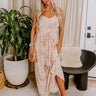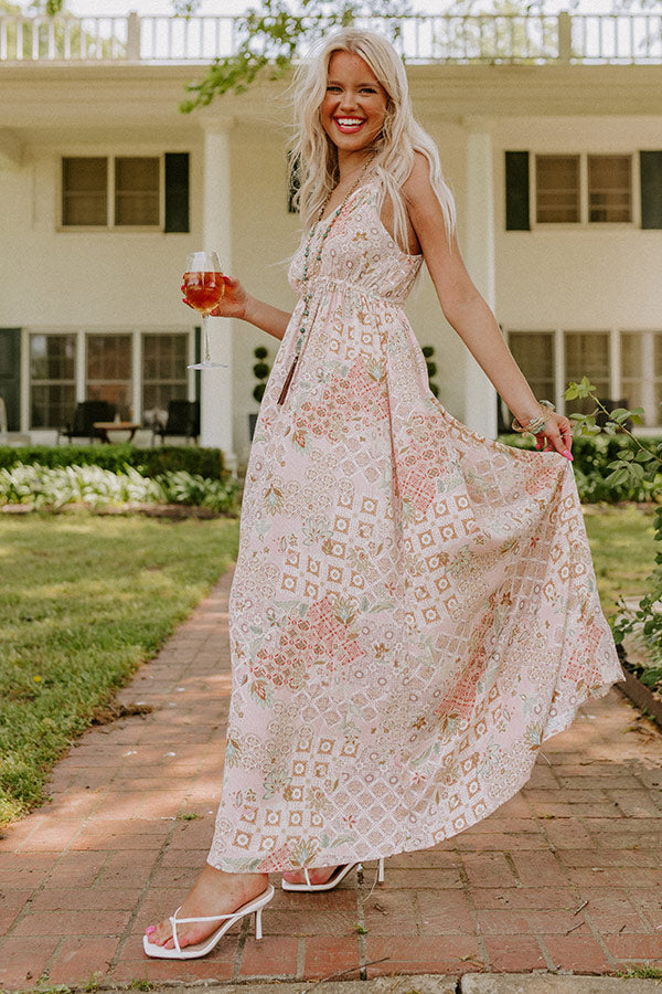 There is no better piece to pack for an island vacay than this beautiful rose quartz colored maxi dress featuring lightweight material patterned with an intricate geometric floral print, a wide v-cut neckline with adjustable spaghetti straps, a cinched waistline, and a relaxed skirt silhouette that falls into a straight ankle-length hemline!