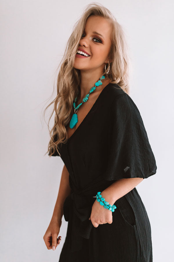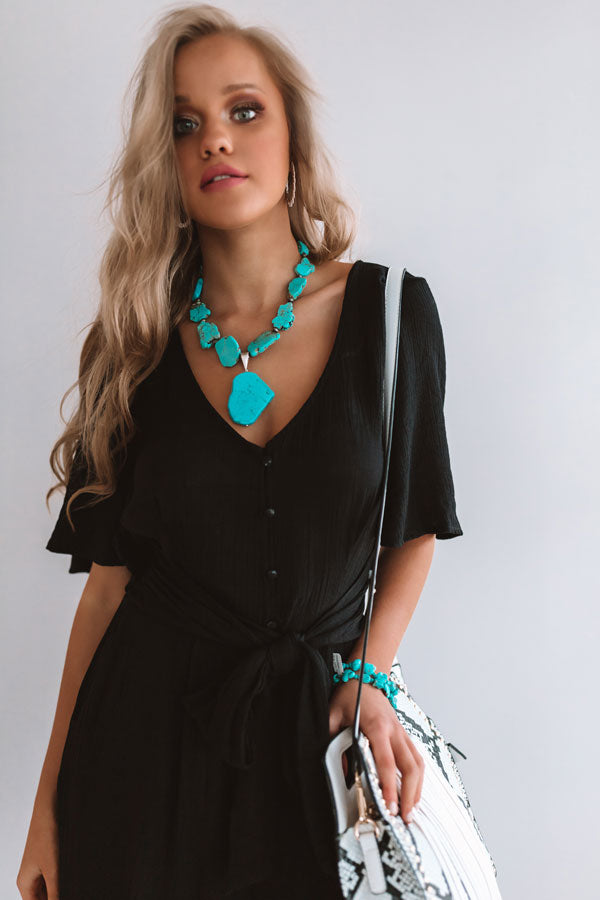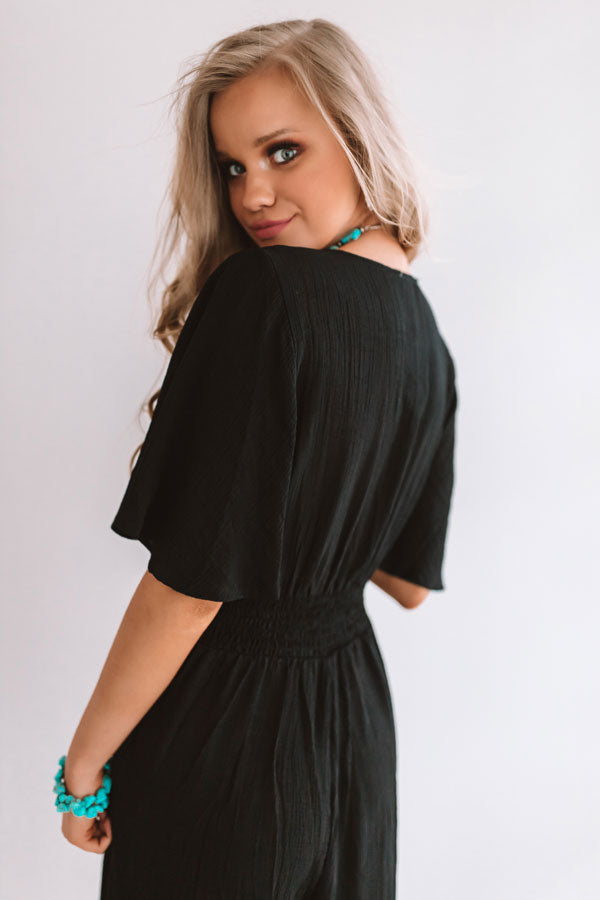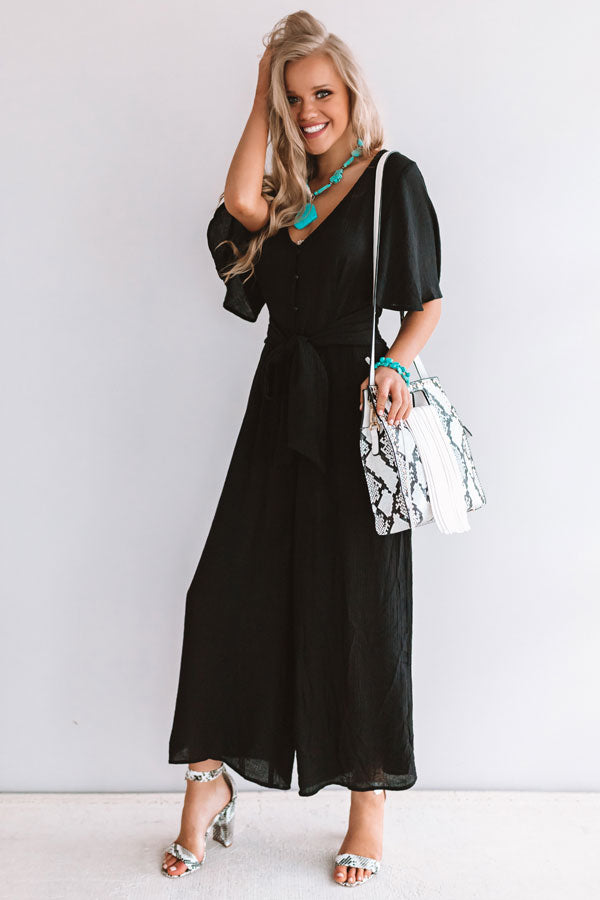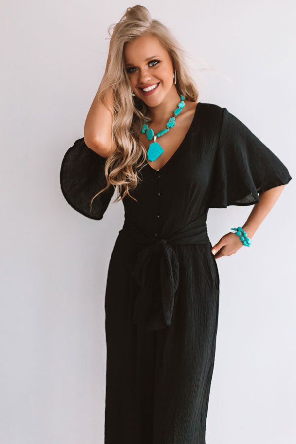 This lightweight jumpsuit is excellent for wearing on your summer travels! It buttons up in the front and even has pockets for you to carry all your travel essentials in! The elastic waistband in the back and belt tie in the front will make you want to wear this piece all over the world!