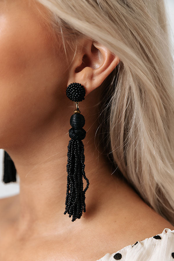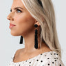 These adorable black statement earring are a total summer vibe with their beaded sphere studs, two dangling spheres, and long beaded tassels!