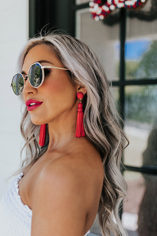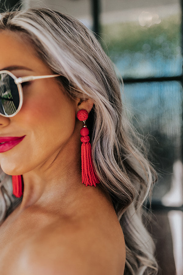 These adorable red statement earring are a total summer vibe with their beaded sphere studs, two dangling spheres, and long beaded tassels!