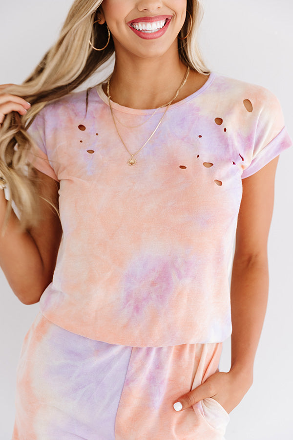 Achieve endless summer style with our trendy "It's All Good" romper featuring soft lightweight material patterned with orange and light purple hued tie dye, a high rounded neckline, subtle distressed detailing, short loose sleeves, a cinched waistline, side pockets, a keyhole accented upper back with a button closure, and a relaxed shorts silhouette that falls into straight upper-thigh length hemlines! This colorful cutie pairs perfectly with a matching sneaker, baseball cap, and faux leather backpack, but you can also wear it with our clear strap "Candi Sandal" and our "Beachy Vbe Woven Tote!"