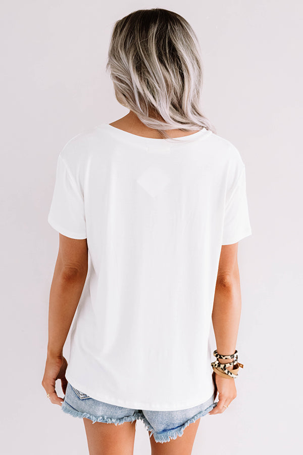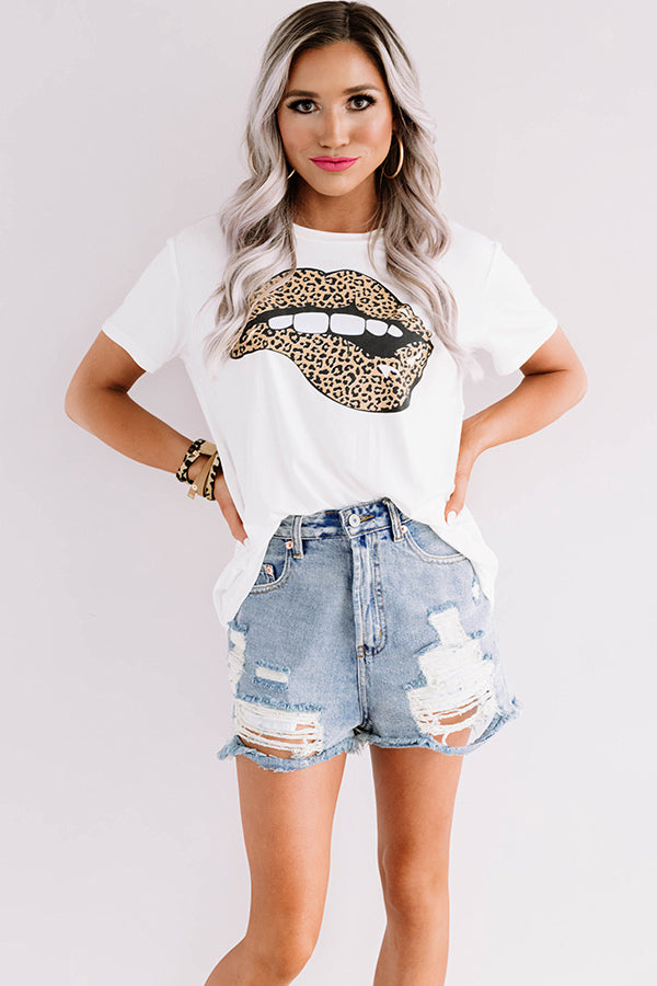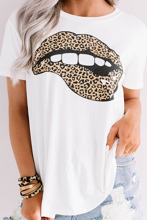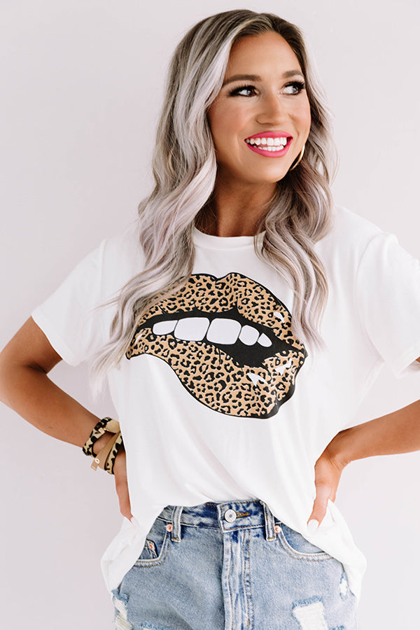 Glam up your graphic tee collection with our trendy white "It's Glossy" shift tee featuring soft lightweight material with a glossy leopard lips graphic on the front, a high rounded neckline, short loose sleeves, and a relaxed silhouette that falls into a straight hemline! You can style this casual chic piece a variety of ways, like with some distressed denim shorts and matching sneakers, but you can also wear it layered under a pink blazer with our black "Corinna Satin Jogger," sunnies, "The Melina Heel in White," and our "All Business Faux Leather Tote in Black!" Measurements