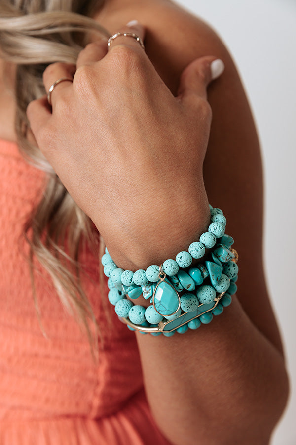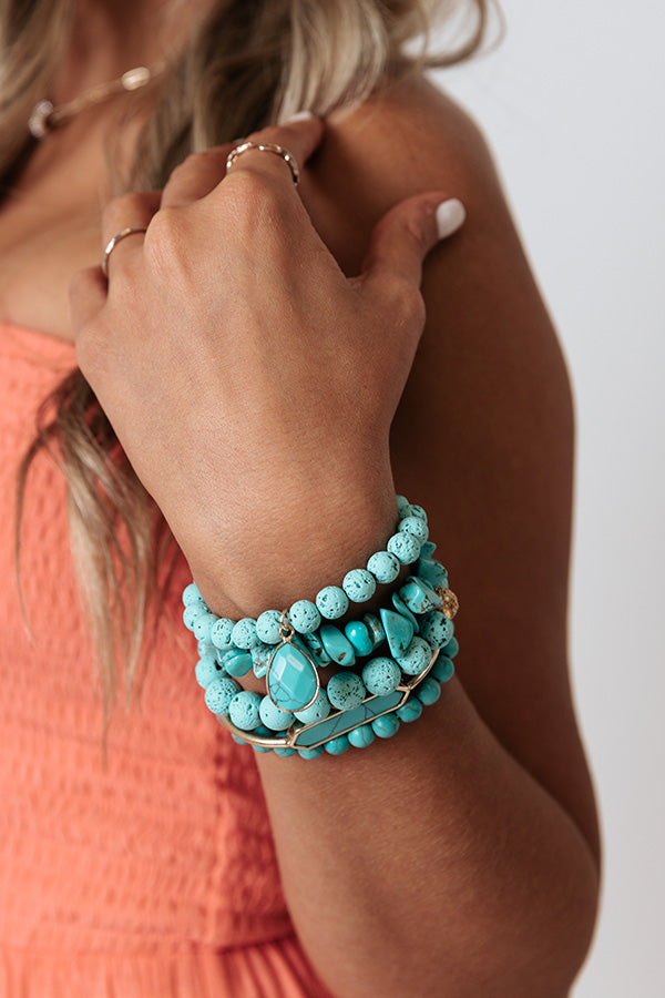 You will look like you belong in the Ivy League when you accessorize with this adorable bracelet set featuring five turquoise bead and faux stone accents! Due to the use of natural stones, stones may vary in size, shape or color.
