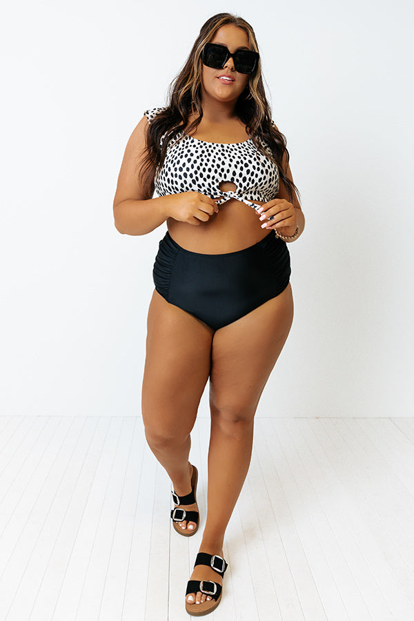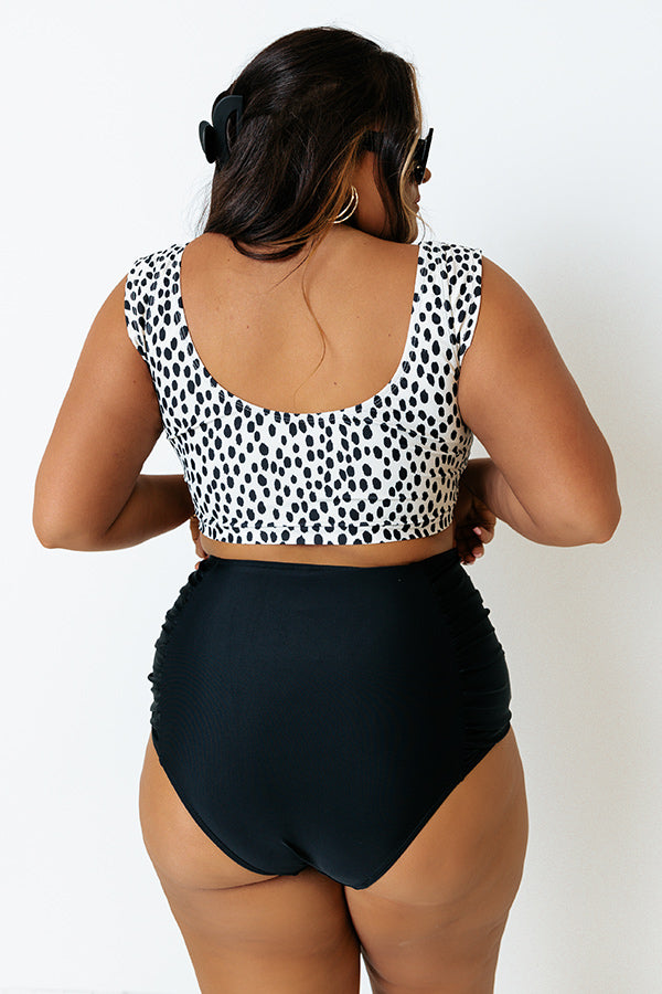 You will look like such a cutie in this darling ivory plus size bikini top featuring lightweight four-way stretch material patterned with black polka dots, a scooped neckline, wide shoulder straps, and a flattering figure hugging silhouette that ends in a straight hemline with a front tie closure! This bikini top comes with removable padding.