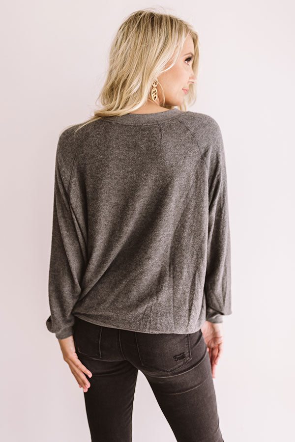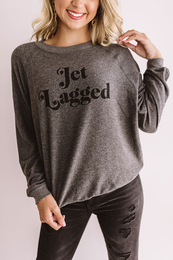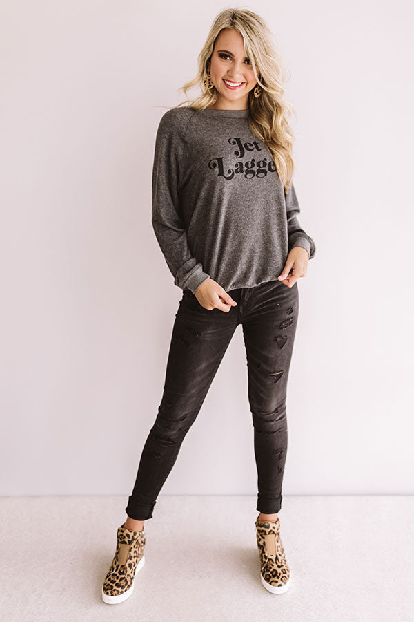 You won't find a more comfy piece to feel jet lagged in than this charcoal sweatshirt featuring a high rounded neckline, soft material, cute front lettering, long sleeves with fitted cuffs, and a relaxed bodice that falls into a straight hemline! You can style this piece with some distressed black ankle skinnies and leopard bootie wedges, or you can keep it extra cozy while you're traveling when you wear it with our pink "Bombshell Joggers" and "The Carter Sneaker in Black!"