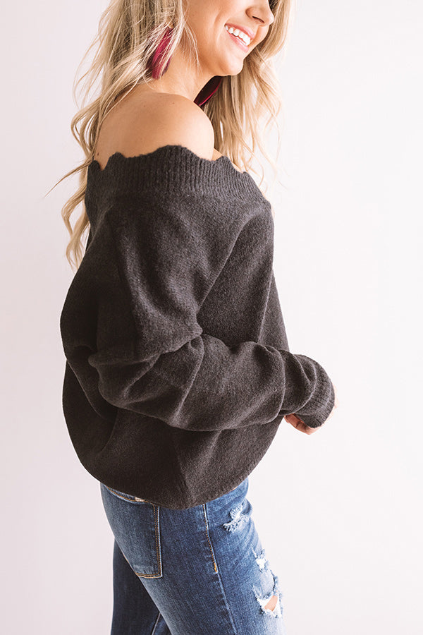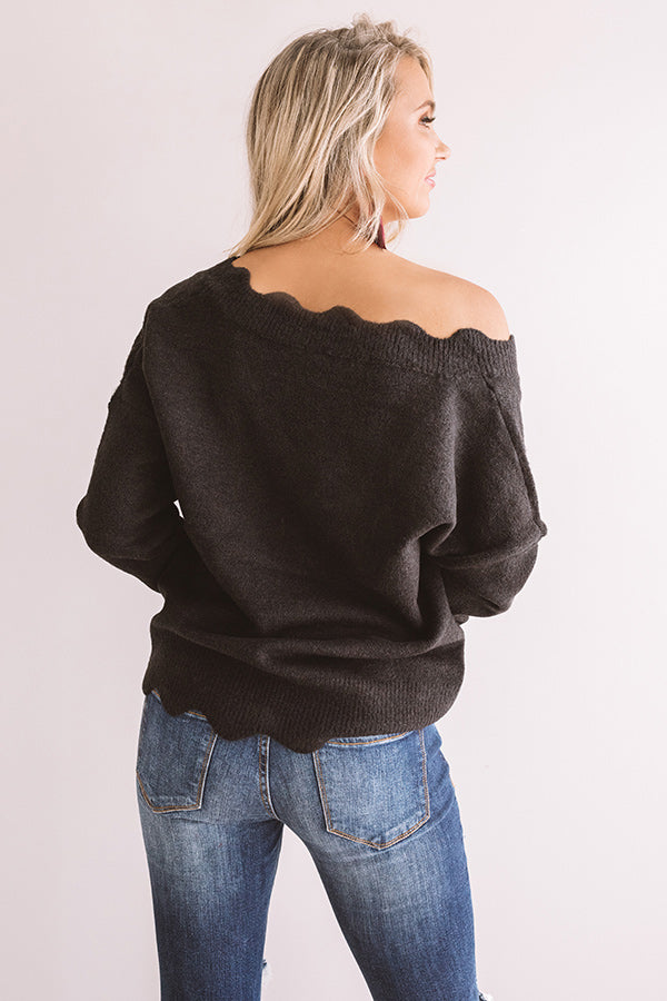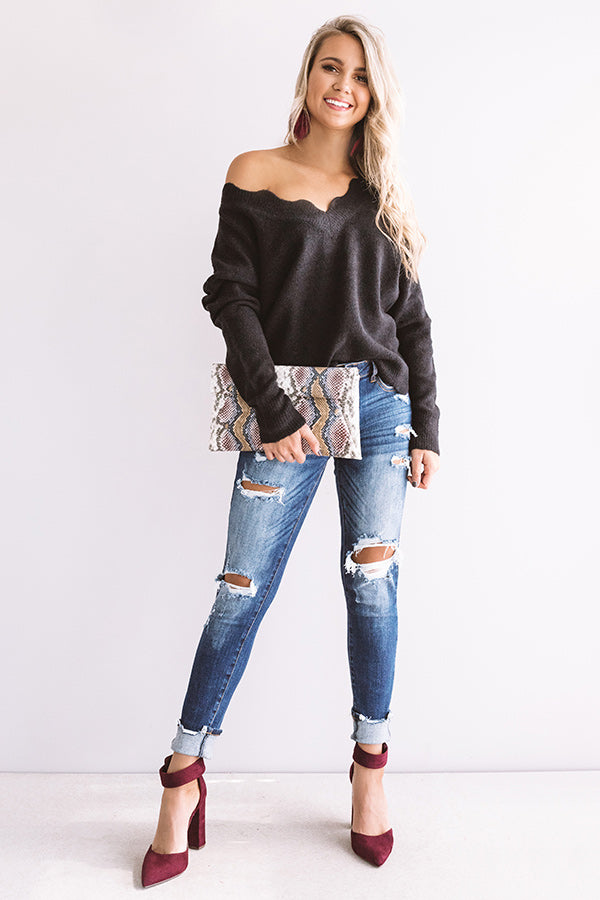 Welcome the fall season in style with our black "Jet Set Snuggles" sweater featuring fuzzy lightweight tight knit material with subtle ribbed texturing, long loose sleeves with fitted cuffs, scalloped trim detailing on the hemline and v-cut neckline that can be worn off one shoulder, and an ultra relaxed silhouette! We have paired this piece with some distressed ankle skinnies, a snake print clutch, and a wine colored pump and statement earrings, but you can also wear it with some colored flares, "The Jillian Peep Toe Bootie in Black," and our "Ciao Bella Leopard Hair Scarf!" Measurements