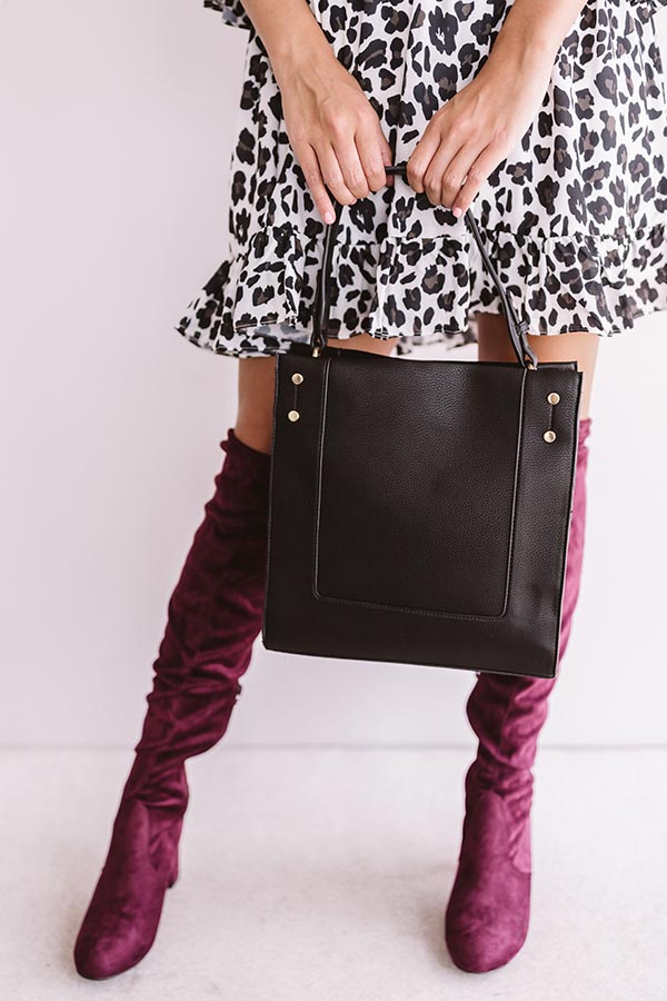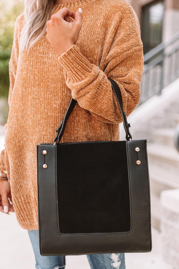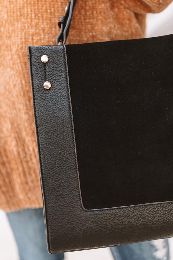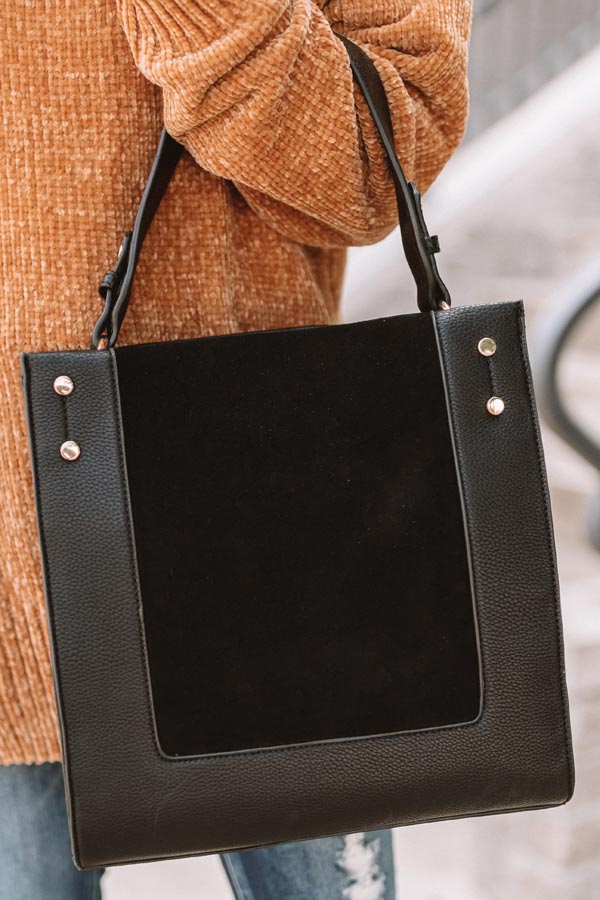 There is no better accessory to carry when you are jet setting to Italy than this black tote featuring a single handle, gold accents, a snap closure pouch that is fully lines with a zipper pocket, and a faux suede panel on the front!