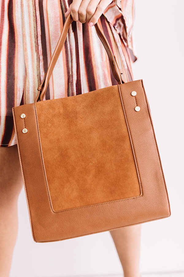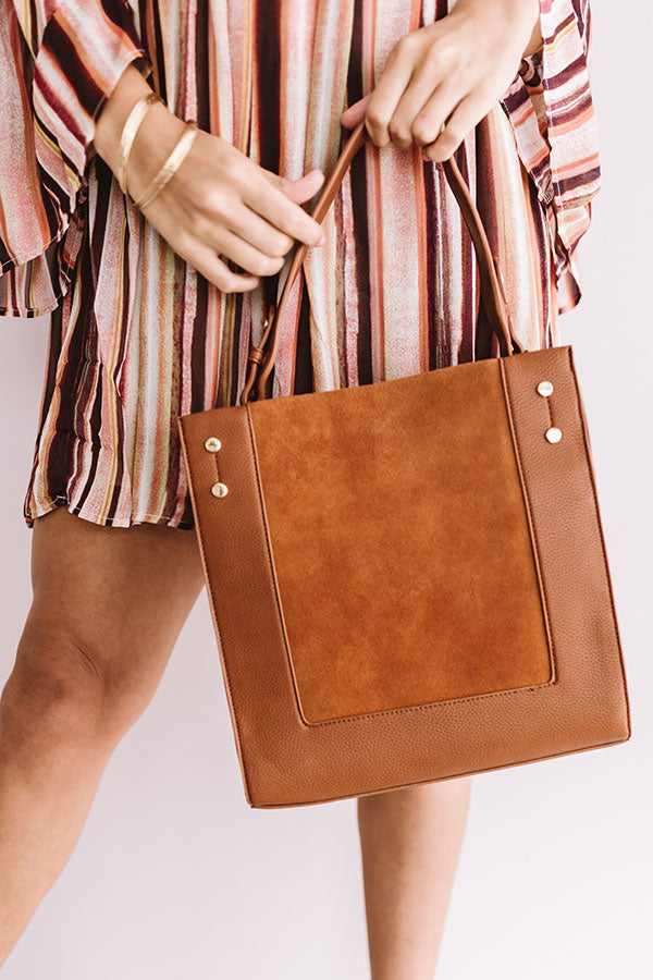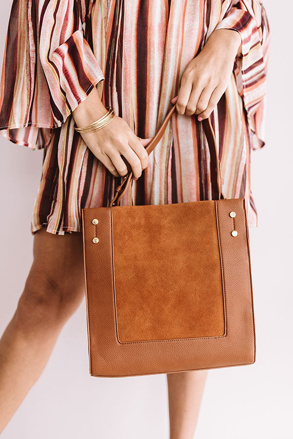 There is no better accessory to carry when you are jet setting to Italy than this cinnamon tote featuring a single handle, gold accents, a snap closure pouch that is fully lines with a zipper pocket, and a faux suede panel on the front!