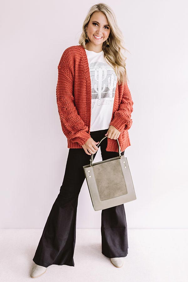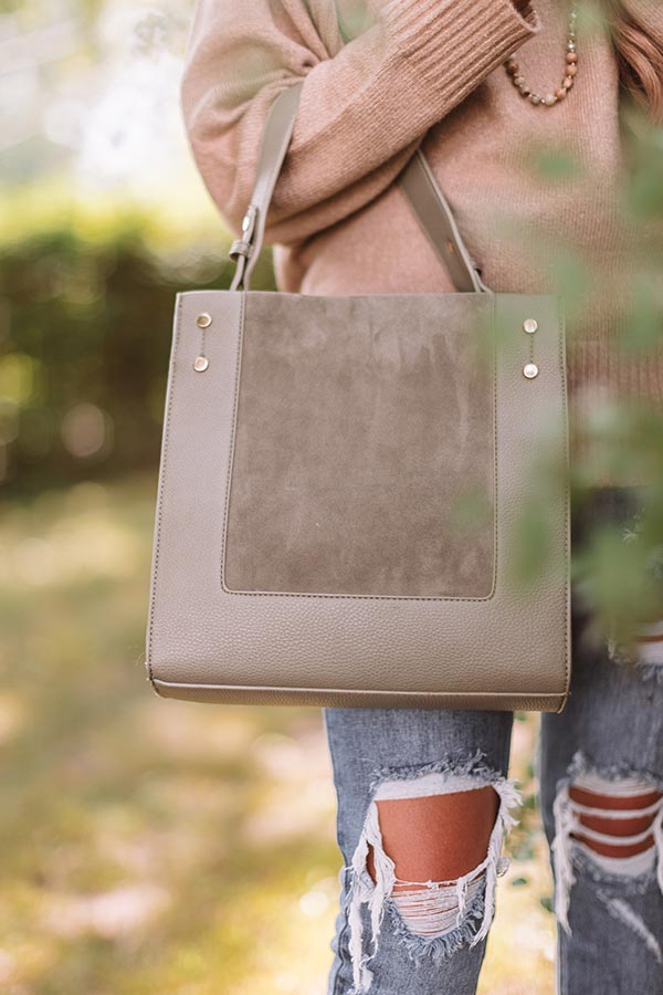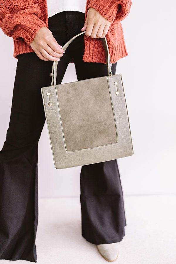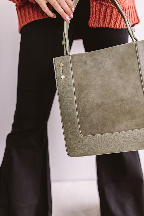 There is no better accessory to carry when you are jet setting to Italy than this olive tote featuring a single handle, gold accents, a snap closure pouch that is fully lines with a zipper pocket, and a faux suede panel on the front!