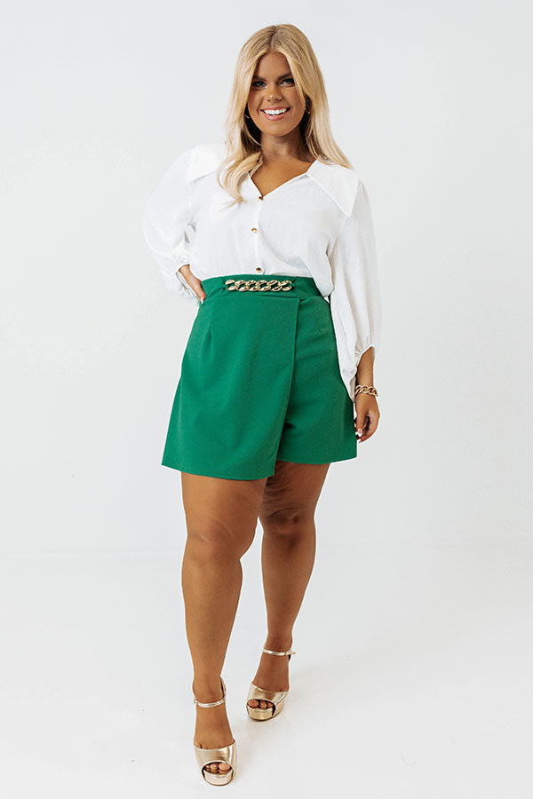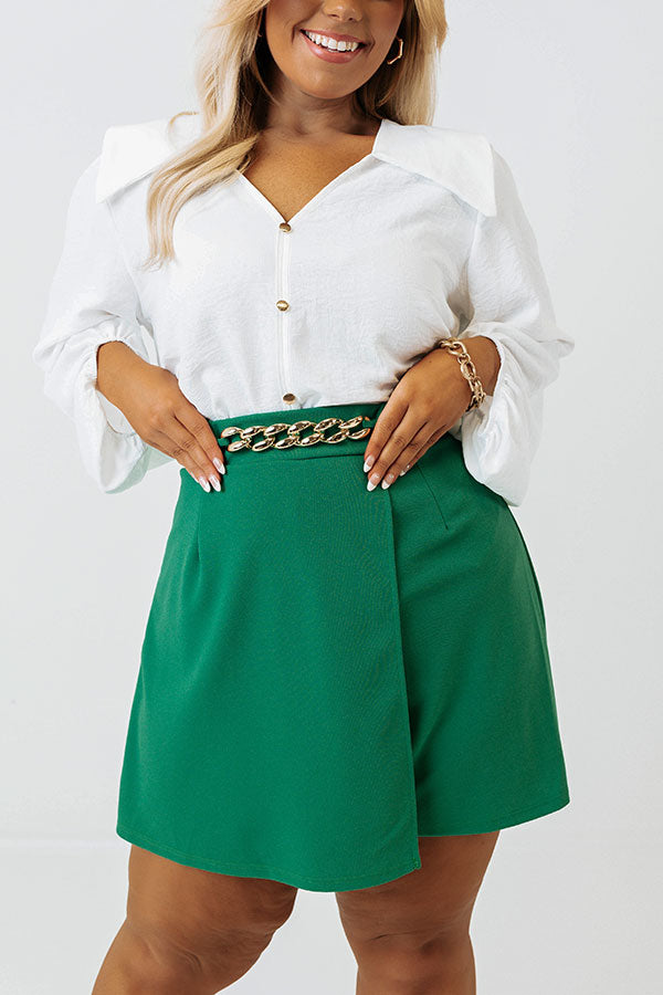 Our chicest piece yet, the luxe kelly green hued plus size 'Jetset To Miami Skort' features lightweight material, a high waistline with a gold chain link accent, and a wrap front silhouette that ends in straight upper-thigh length hemlines!