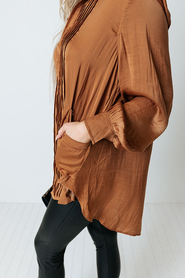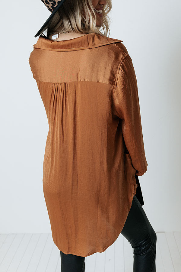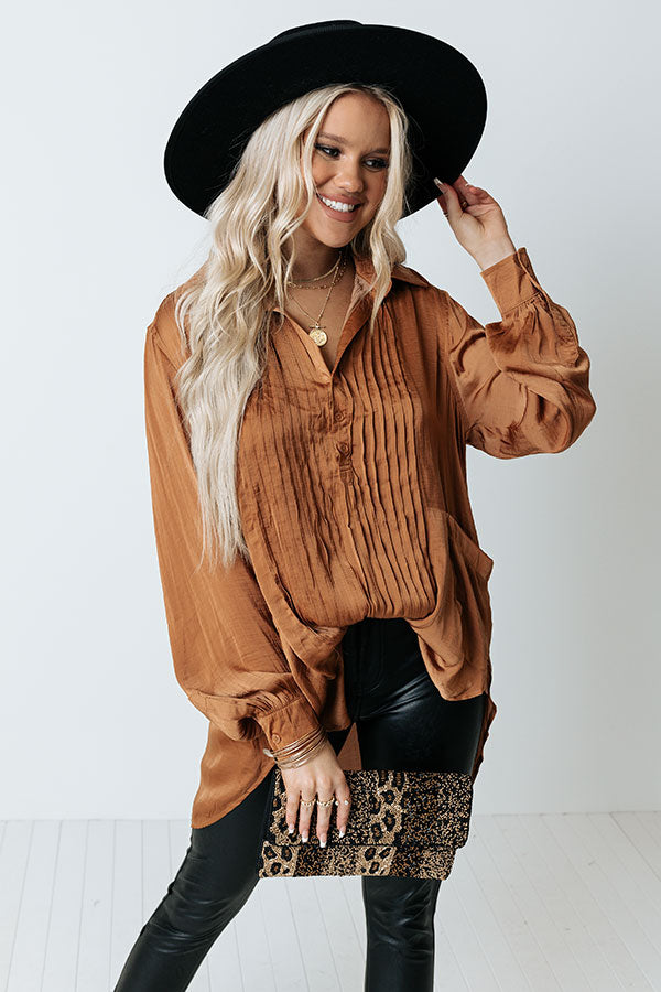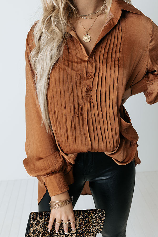 Jet away for a winter vacay in this pretty copper colored top featuring lightweight satin material with pleated texturing, a button closure bodice with a collared v-cut neckline, log loose sleeves with button closures, hidden side pockets, and a relaxed silhouette that falls into a rounded tunic-length hemline! Measurements
