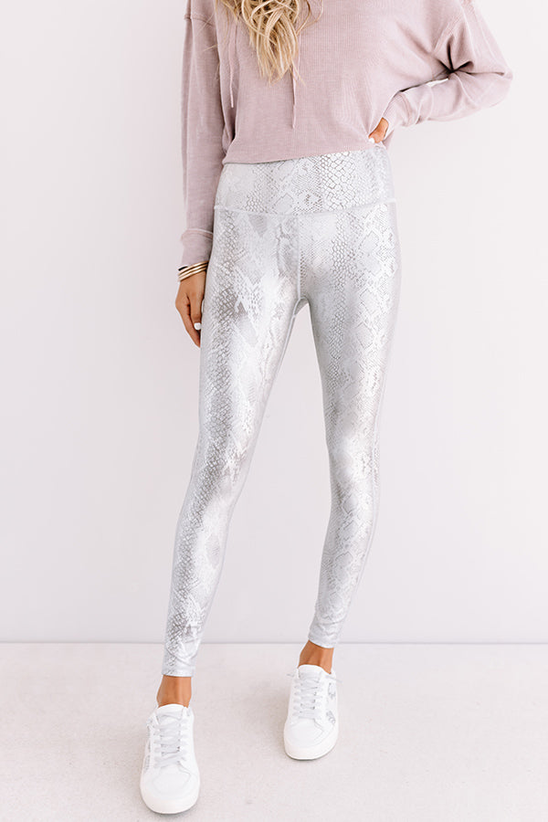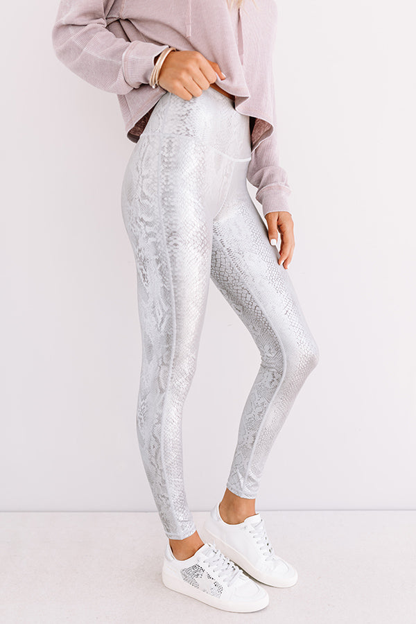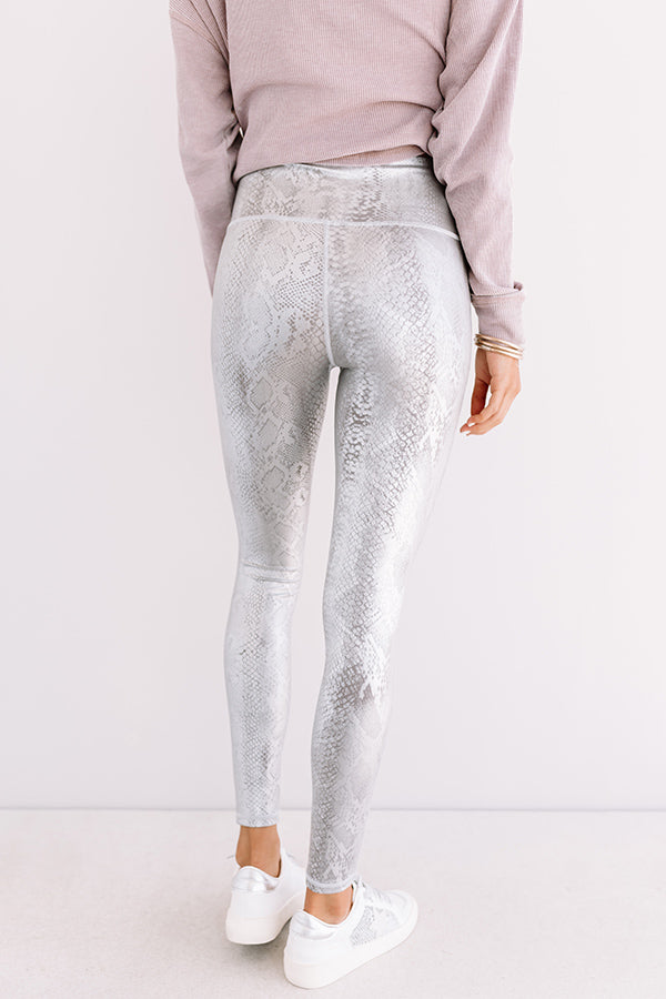 Strike a pose in our eye-catching "Jog My Memory" active legging featuring lightweight four-way stretch material patterned with a metallic silver snake print, a high waistline for tummy control, and a form fitting silhouette that falls into ankle-length hemlines! We recommend styling this piece with a casual hoodie and trendy white sneakers for the perfect athleisure look! Measurements