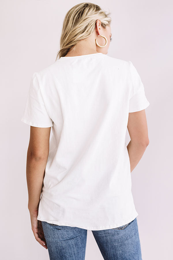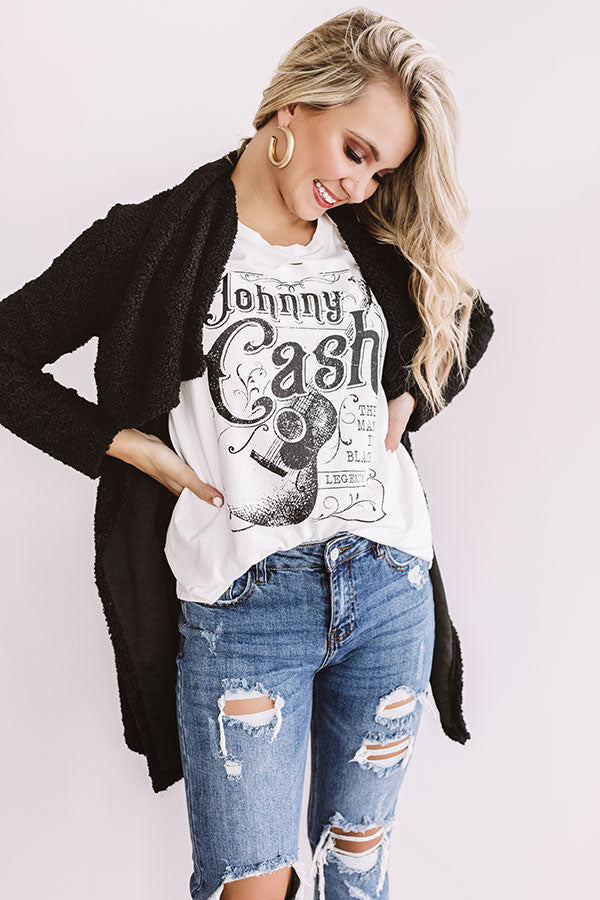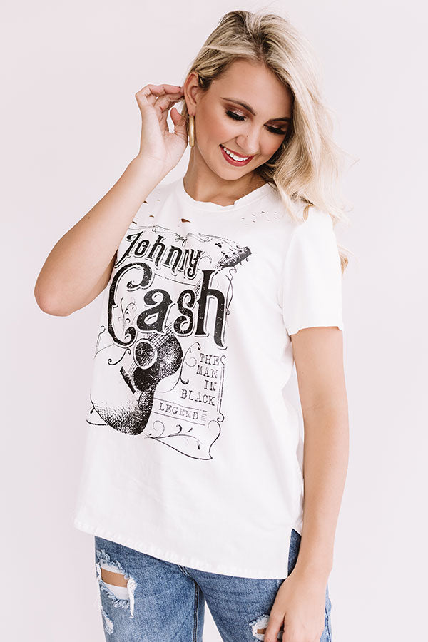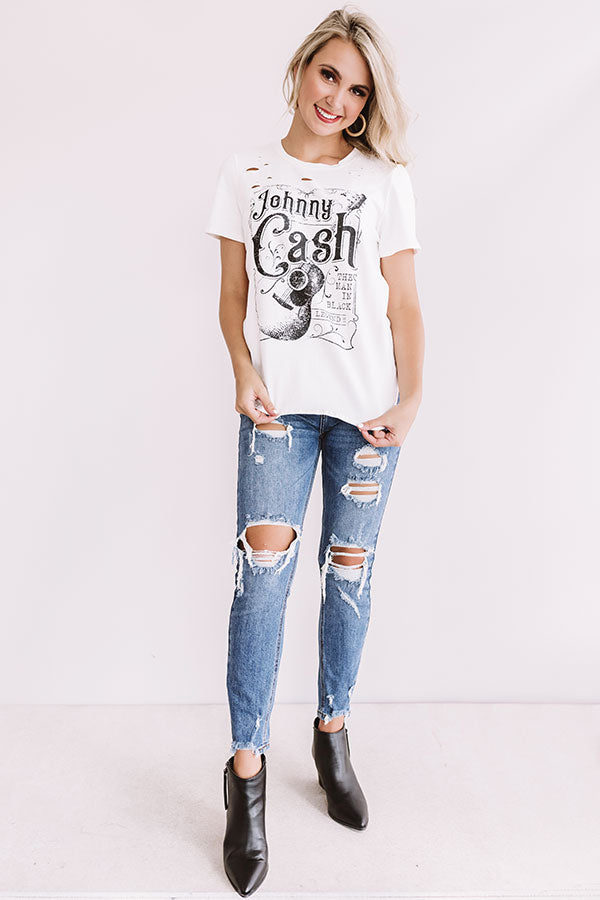 We're OBSESSED with distressed and this white "Johnny Cash" boyfriend tee has plenty of it! The high rounded neckline, short sleeves, ultra relaxed bodice, straight hemline, and graphic front styles perfectly under a black cardigan with some distressed ankle skinnies and black pointed booties! You can also wear it tucked into our "Vineyard Visit Leopard Skirt" with our "Name Dropper Hat in Black," some trendy sneakers, and a black backpack for a fashionable but laid back everyday look! Measurements