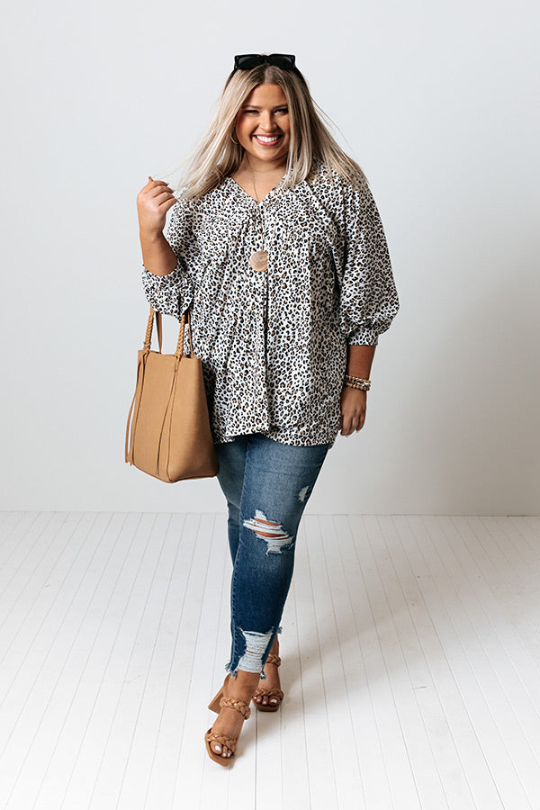 Plus Size - Join the club and add this adorable top to your cart! It features lightweight flowy material patterned with a black and light brown leopard print, a high v-cut neckline and upper back 3/4-length bubble sleeves with fitted cuffs, and a slouched silhouette that ends in a straight hemline! Measurements