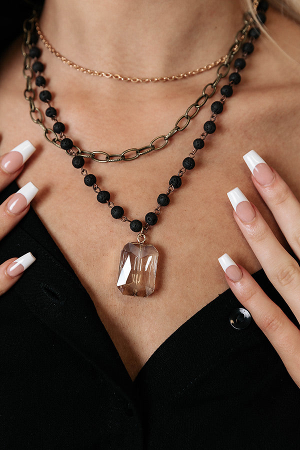 Make a statement with our pretty 'Joyland' necklace featuring three layered pieces: a dainty gold chain choker, a medium length bronze chain, and a longer black beaded chain with a large clear gemstone pendant!