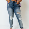 People are sure to envy your denim style when you arrive in our trendy plus size 'Marisol' jean featuring lightweight medium wash material with accent fading and distressed detailing, a midrise waistline with belt loops, a classic four-pocket cut, a hidden zip fly with a button closure, and a flattering figure hugging silhouette that ends in straight ankle-length hemlines that can be cuffed!