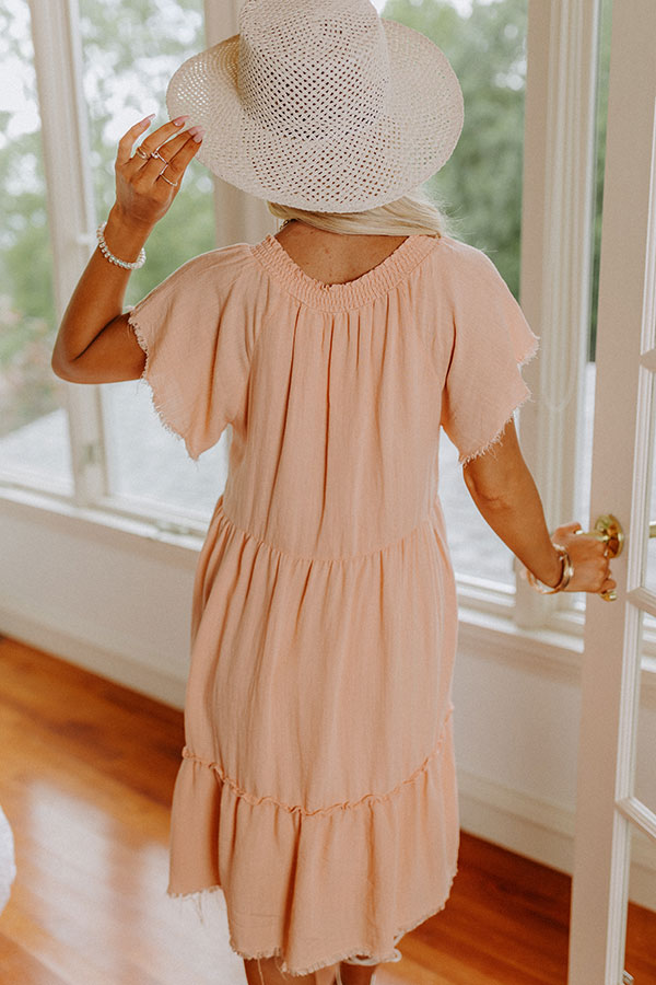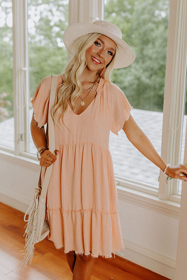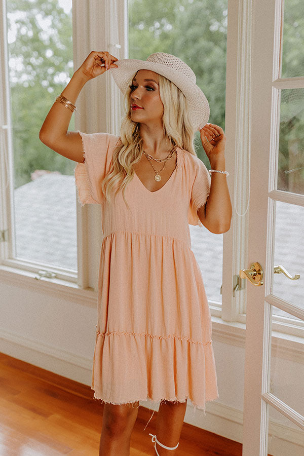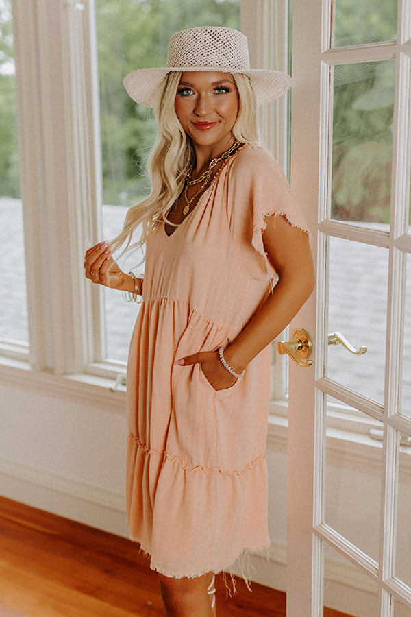 Looking for a simple but stylish look? Then don't hesitate to add our peach colored 'Just A Call Away Shift Dress' to your cart with its soft lightweight and flowy material, v-cut neckline with a smocked back, short loose sleeves, hidden low side pockets, frayed trim detailing, and relaxed but flattering silhouette that falls into an uneven knee-length hemline!