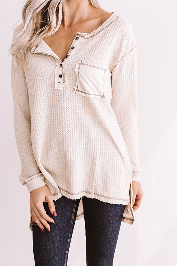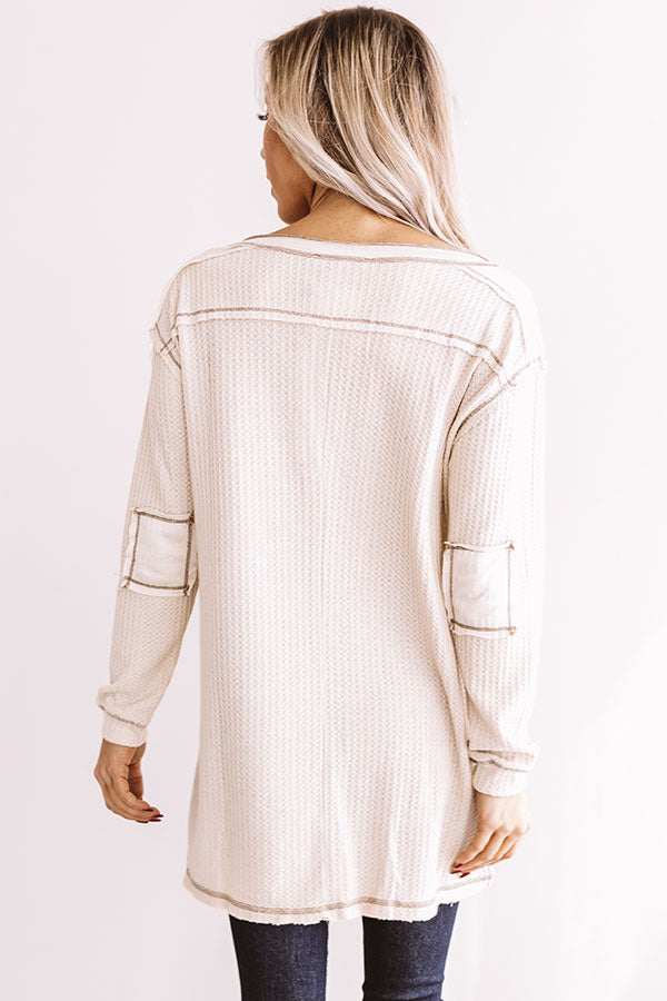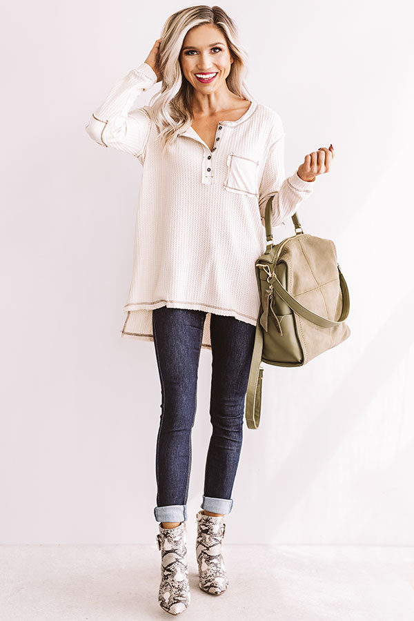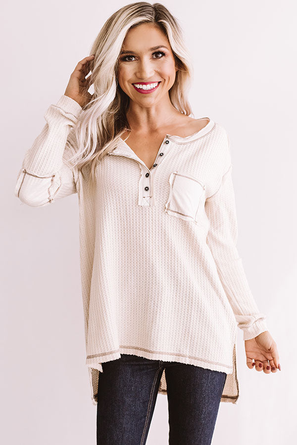 This top was once just a dream, but now it can be your reality! We honestly couldn't have dreamed up a better waffle knit top to add to our wardrobe. This top comes complete with a front pocket, exposed seams, a raw high-low hem, buttons at the neckline, and sewn on elbow patches. Pair under your favorite cozy cardigan and add snake print boots for a stylish look you'll love! Measurements