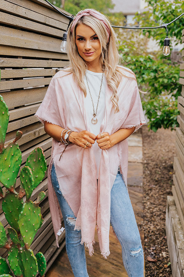 Groove through summer in this darling blush overlay featuring lightweight breezy material patterned with subtle white tie dye, oversized bat wing half sleeves, and an ultra draped open front silhouette that cascades into a straight knee-length hemline with high side slits and frayed trim detailing! Measurements