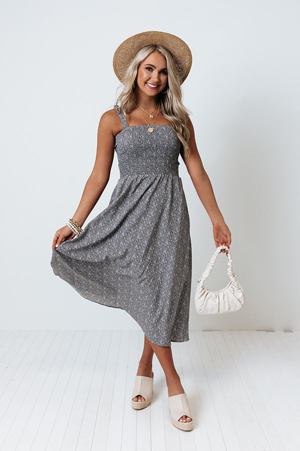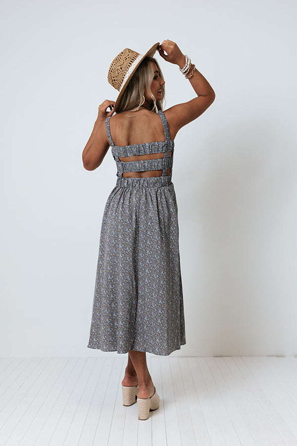 Groove through summer in style with this adorable airy blue midi dress featuring lightweight flowy material patterned with a small natural hued paisley print, a square neckline with 1-inch shoulder straps, a smocked bodice with a two strip cutout back, accent side pockets, and a relaxed skirt silhouette that cascades into a straight mid-calf length hemline! Measurements