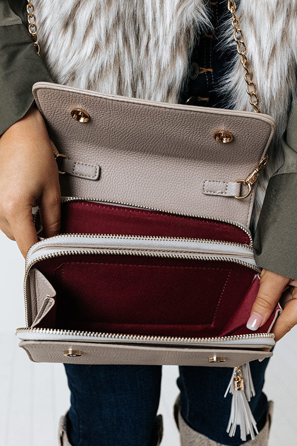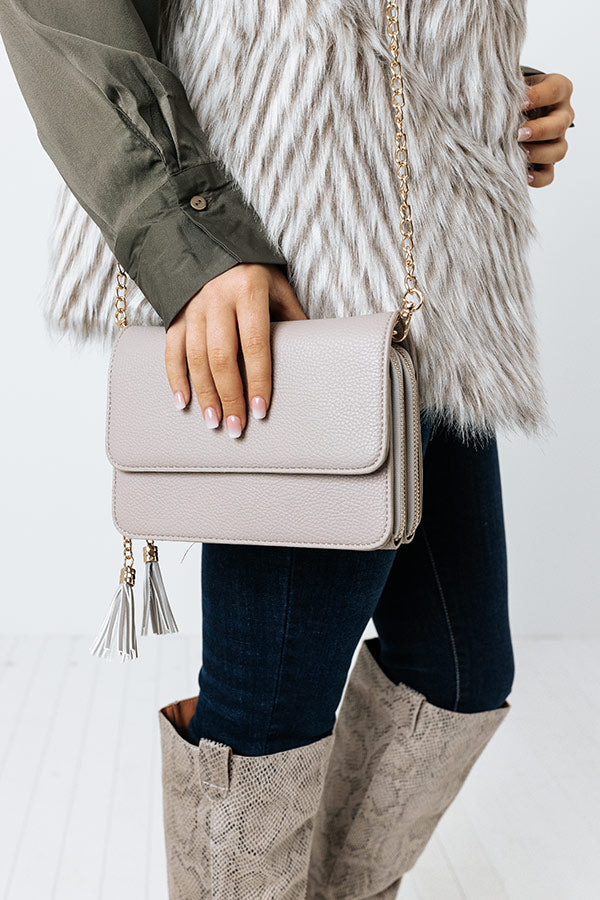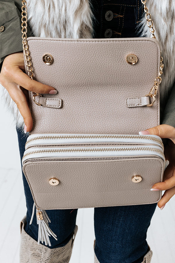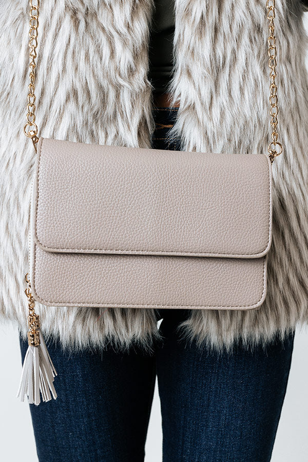 New handbags dropped just in time for the holidays! This pretty birch colored purse features faux leather material, a flap closure with a snap button, a gold chain shoulder strap, and a spacious rectangular interior with two zip closure pouches!