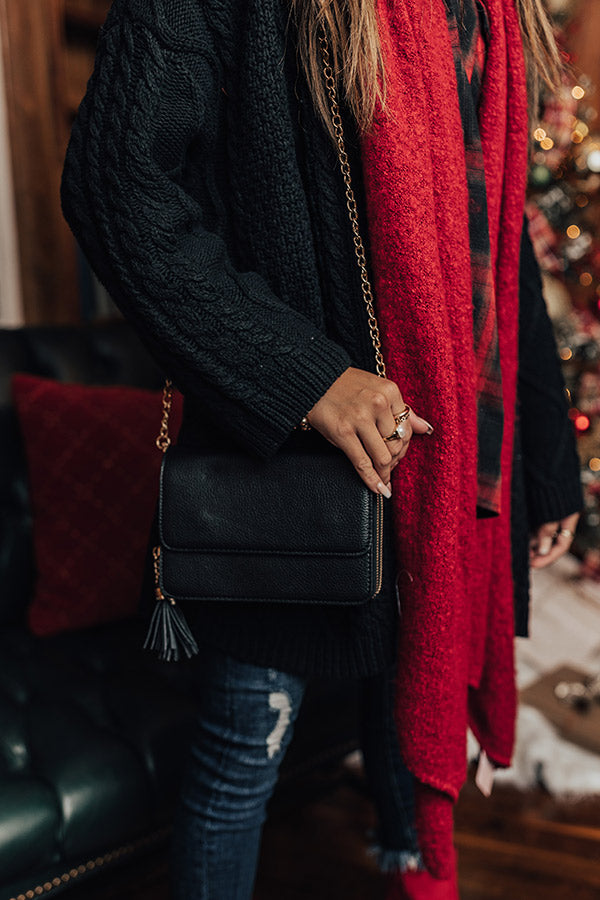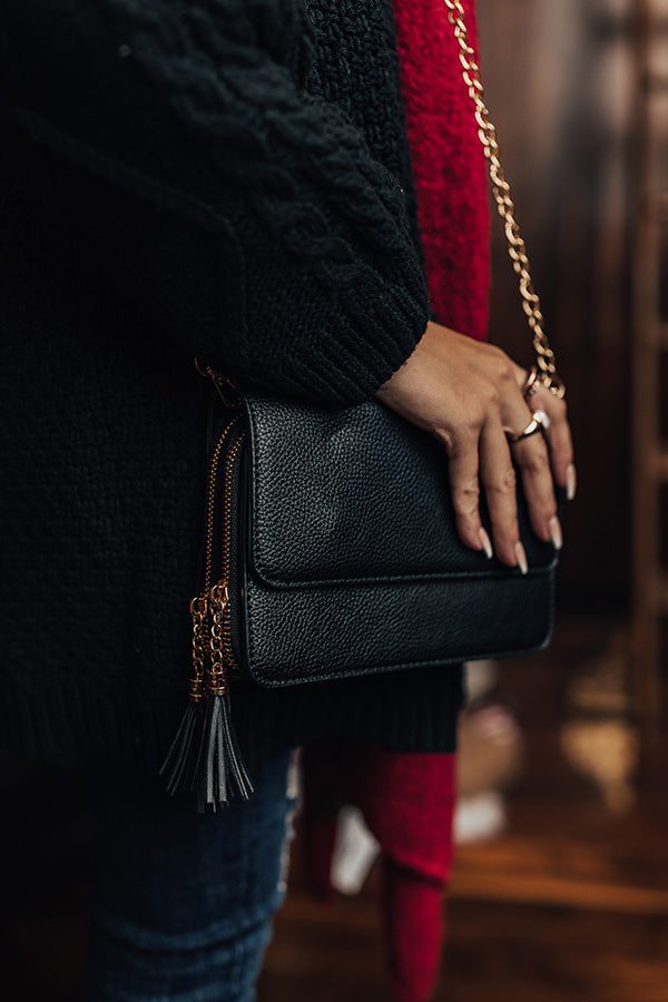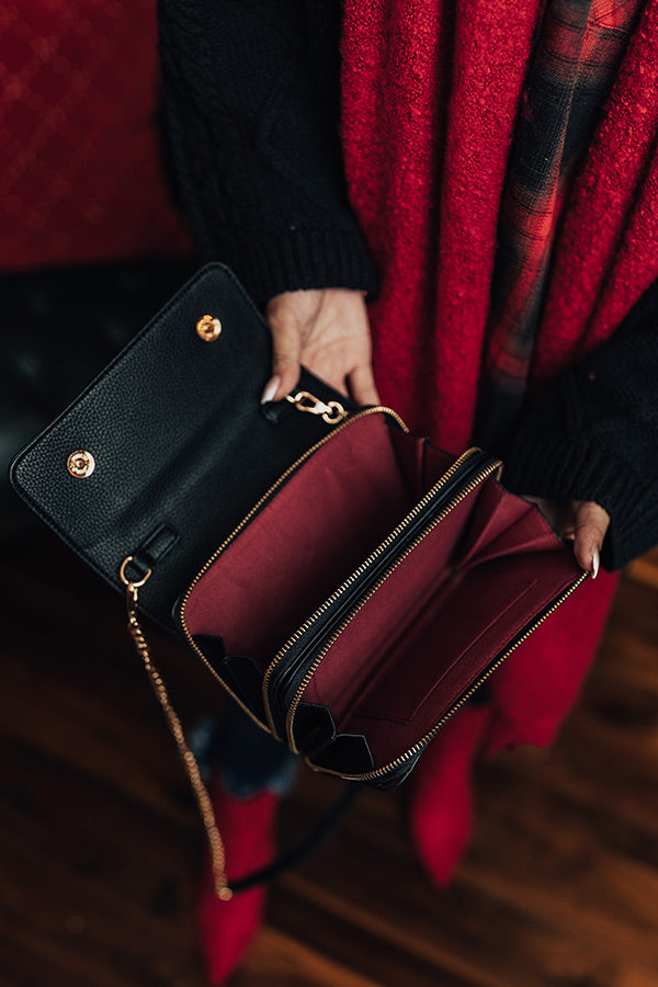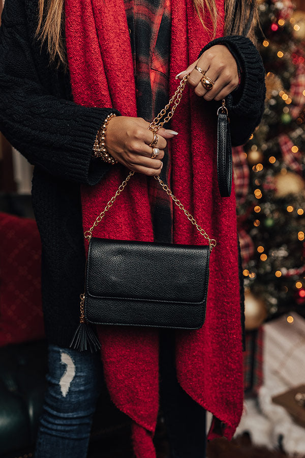 A cute new purse dropped just in time for the holidays! It features sleek faux leather material, a flap closure with two snap buttons, a removable gold chain link shoulder strap, and a spacious fully lined interior with two zip closure pouches!