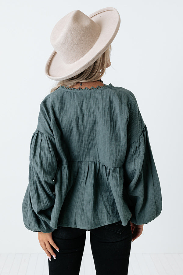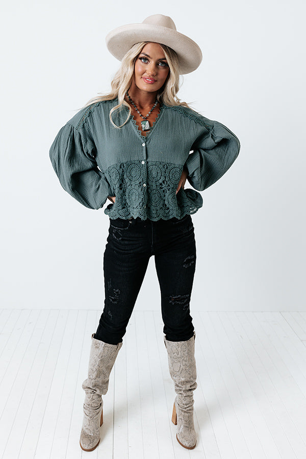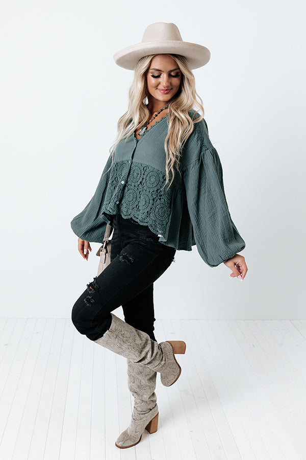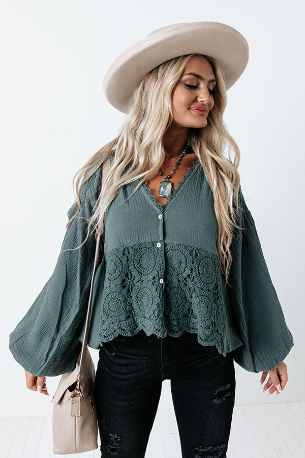 This cute light forest colored shift top dropped just in time for the holidays with its soft lightweight material with crochet detailing throughout, a button down front with a v-cut crochet trim neckline, long loose sleeves, and a relaxed silhouette that falls into an uneven hemline! Measurements