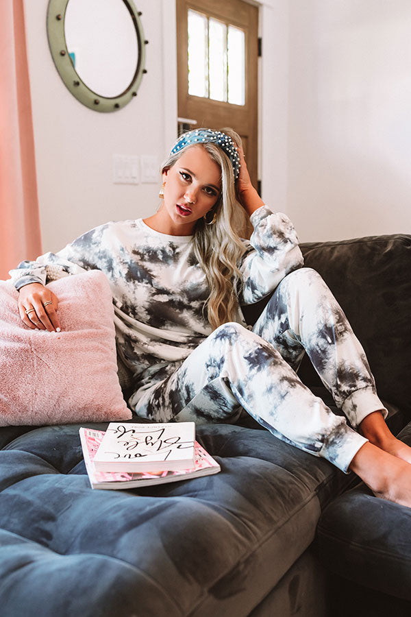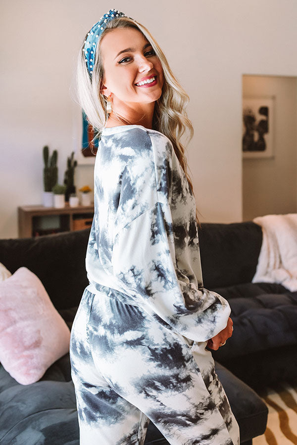 There is no better piece to "just relax" in than this trendy AND adorable sweatshirt featuring ultra soft lightweight material patterned with dark tie dye, a wide rounded neckline, long loose bubble sleeves with fitted cuffs, and a relaxed silhouette that falls into a rounded hemline! This comfy piece styles perfectly with our matching "Just Relax Tie Dye Joggers," a headband, and some fuzzy slippers for the ultimate two-piece lounge look!