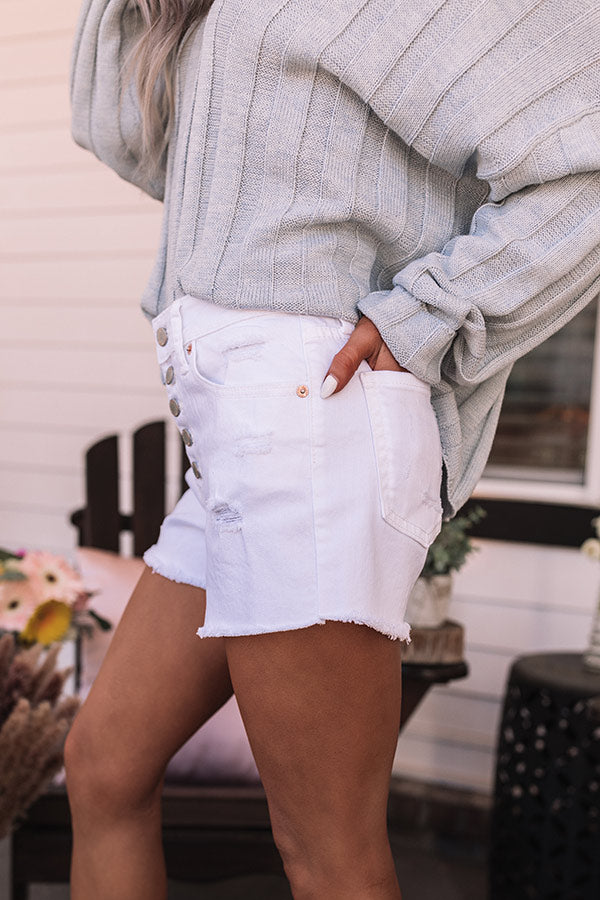 Our trendy white 'Hannah' shorts are sure to be your new spring fave with their lightweight and stretchy denim material, subtle distressed detailing, a high waistline with belt loops, a five button closure, a classic five pocket cut, and a relaxed but flattering silhouette that ends in raw-cut upper-thigh length hemlines!
