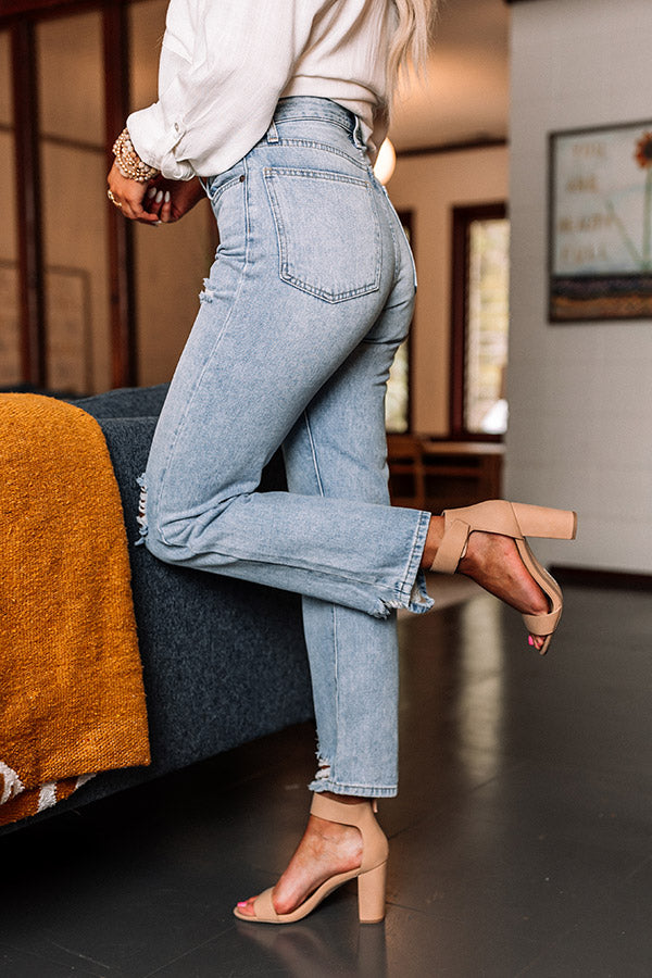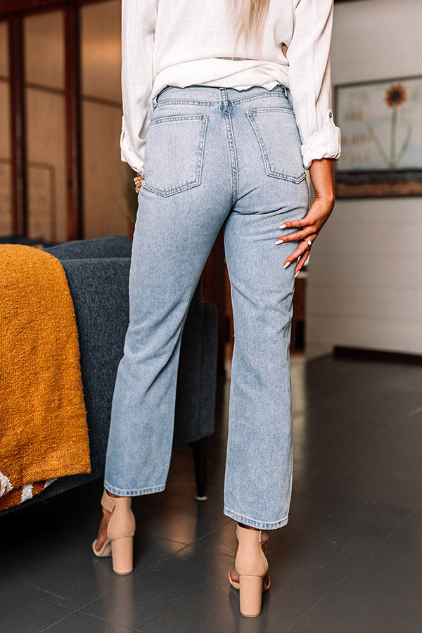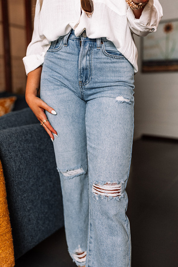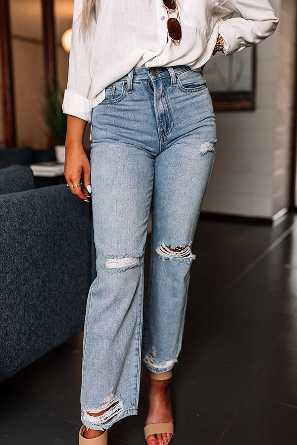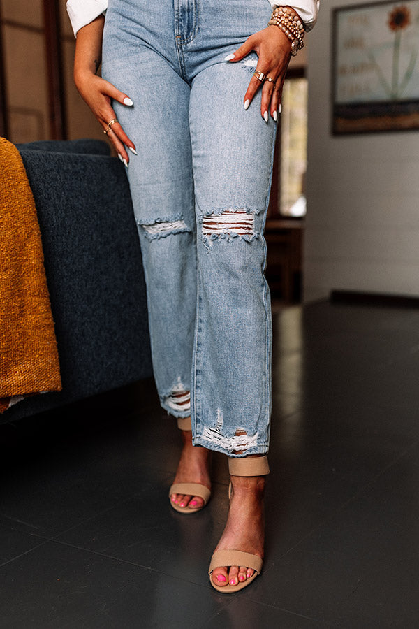 Welcome spring in style with our trendy 'Lala' jean featuring lightweight light wash denim material with distressed detailing and accent fading, a high waistline with belt loops, a hidden zip fly with a button closure, a classic four pocket cut, and a relaxed silhouette that ends in straight ankle-length hemlines!