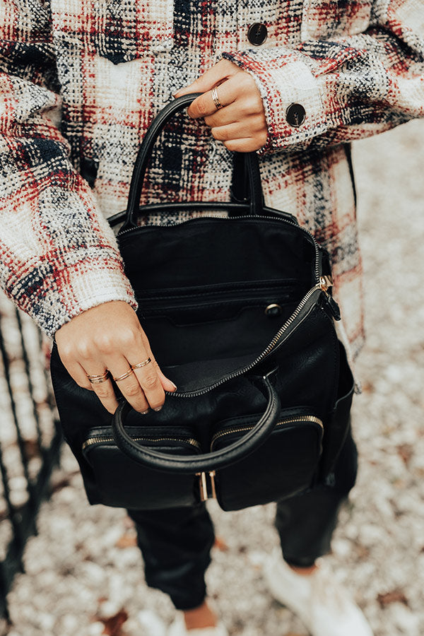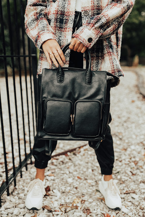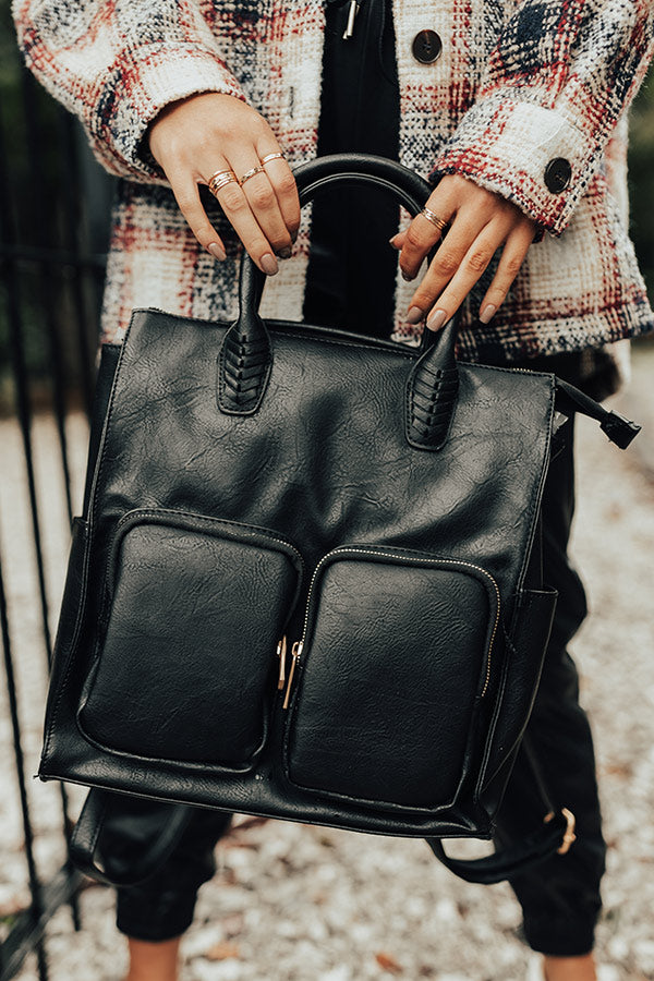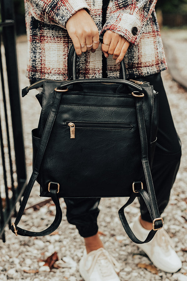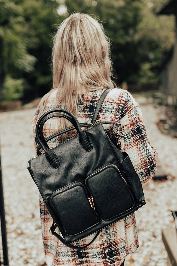 This chic black backpack is just what you need this fall with its sleek faux leather material, two zip closure front pouches and a single back zip closure pocket, two tote handles, two adjustable and connected shoulder straps and a spacious zip closure silhouette!