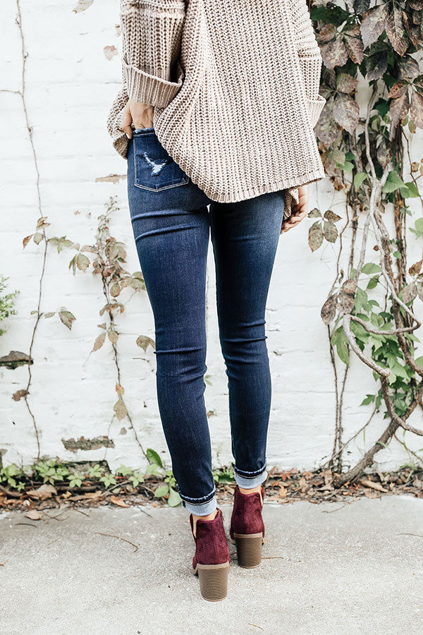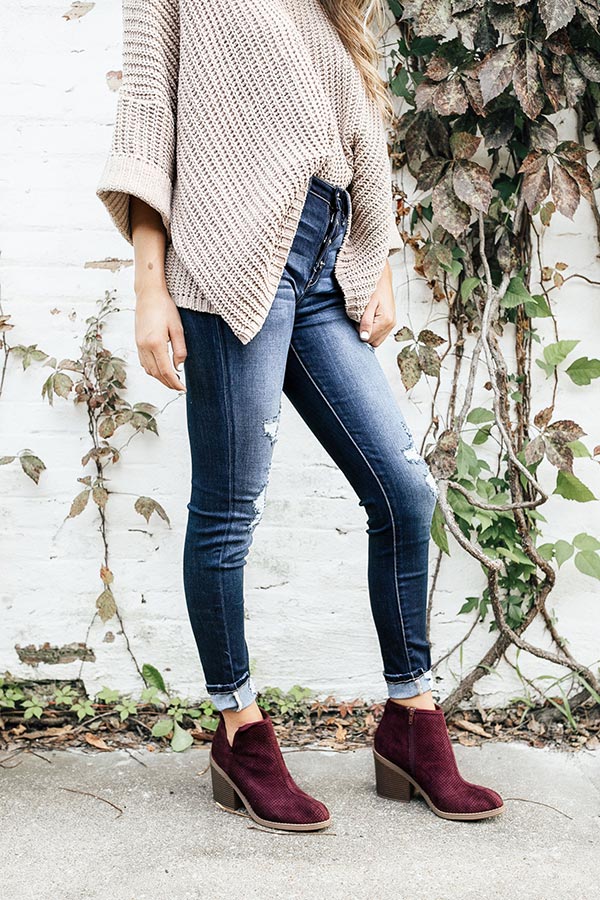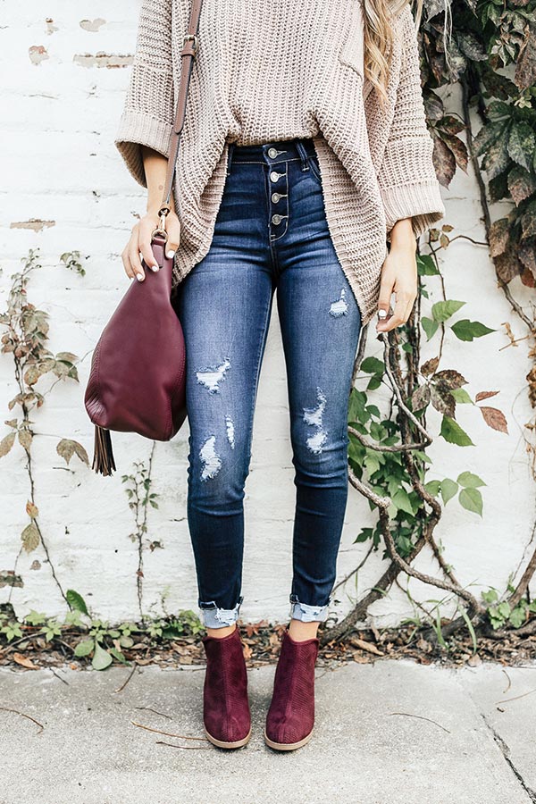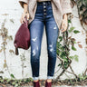 Bonjour Babe! Can you say gorgeous?! These distressed skinnies are absolutely amazing! They are high-waisted with a sassy button up detail on the waist! The distressing throughout the legs that go all the way down to the ankle, make these a great casual peice to pair with your fave blouse!