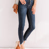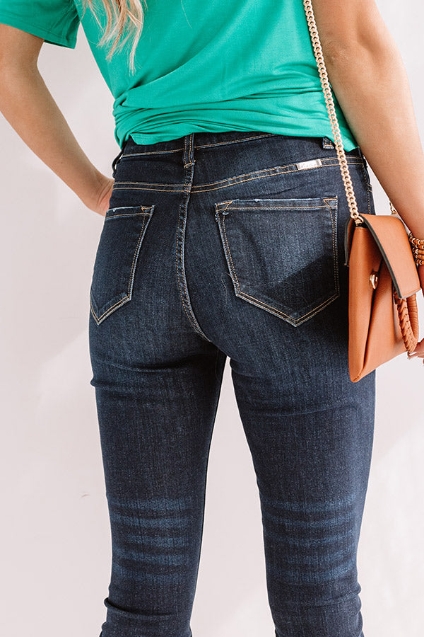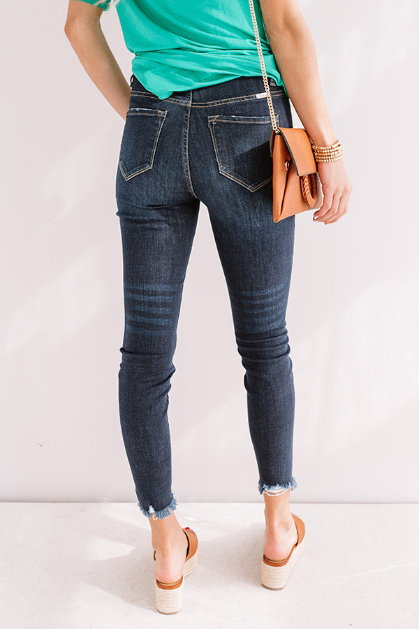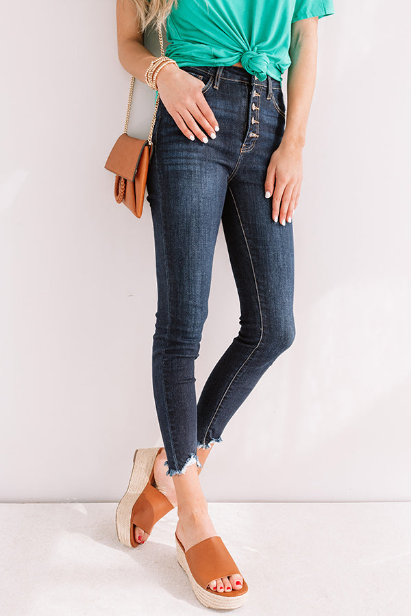The trendiest summer denim just dropped! Our timeless dark wash 'Elodie' ultra skinny features lightweight denim material, a high waistline with belt loops, a classic five pocket cut, a five button closure, and a flattering form fitting silhouette that ends in frayed ankle-length hemlines that can be cuffed!