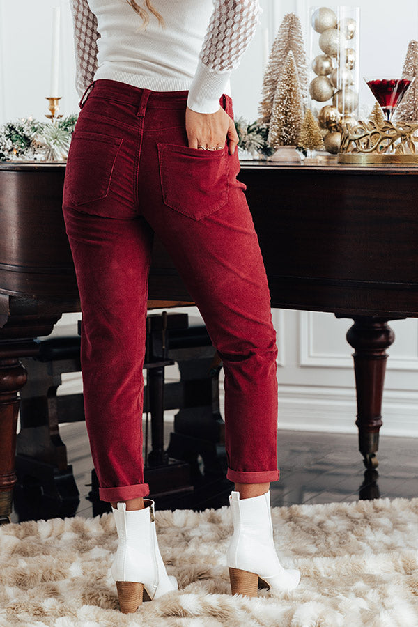 Strut into the holidays in style with our fashionable wine hued 'Hannon' skinny featuring lightweight corduroy material, a midrise waistline with belt loops, four pocket cuts, a hidden zip fly with a button closure, and a flattering relaxed silhouette that falls into straight ankle-length hemlines that can be cuffed!