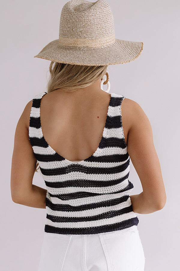 "Keep it beachy" in this charming tank featuring soft lightweight tight knit material with ribbed texturing, white and navy horizontal accent stripes, a v-cut neckline and upper back, 1-inch shoulder straps, and a relaxed silhouette that falls into a straight cropped hemline! We have styled this adorable piece with some frayed white shorts, matching wedges, statement earrings, and a woven hat and tote, but you can also wear it with "The Booker Midrise Flares" and "The Jess Faux Suede Heel in Natural!" Measurements