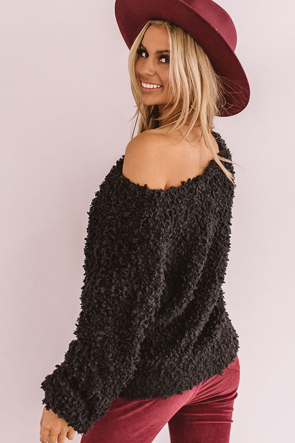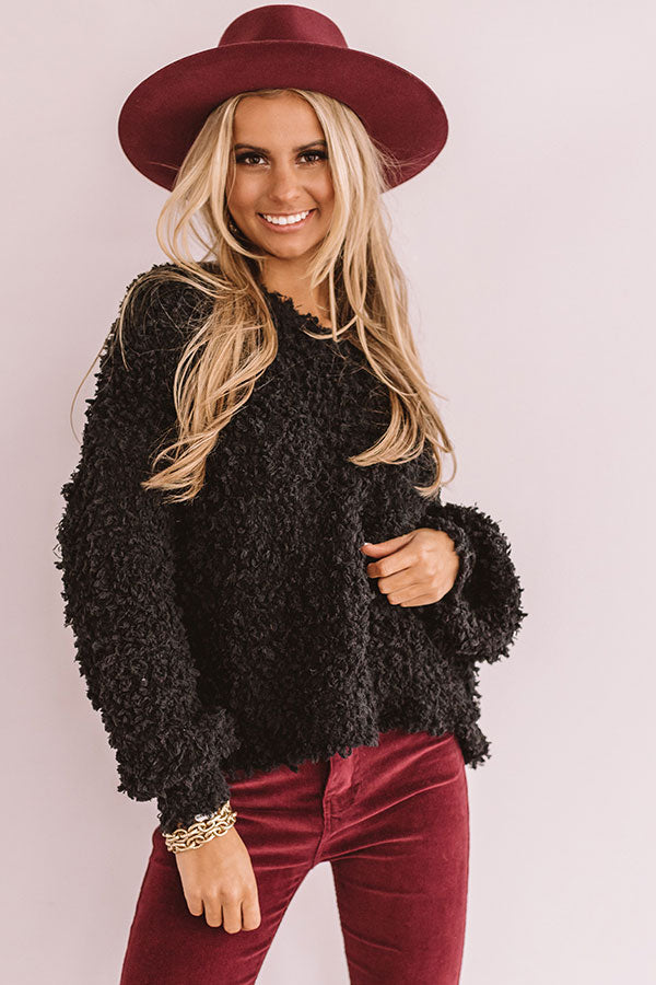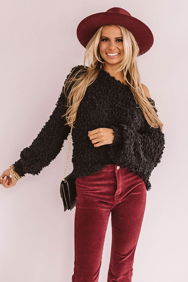 Our black "Keep It Close" sweater provides the perfect coverage to comfortably ease into the colder weather with its soft lightweight popcorn knit material with ribbed texturing, a wide scooped neckline that can be worn to one side, long oversized bishop sleeves with fitted cuffs, and a relaxed silhouette that falls into a straight hemline! We have styled this cold weather essential with some red velvet flares, a matching faux suede hat, and a black bootie and crossbody, but you can also wear it with some distressed ankle skinnies and "The Byrdie Leopard Wedge!" Measurements