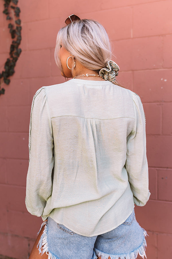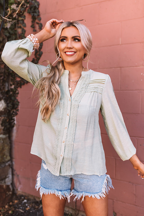 Keep your transitional style cordial with this cute pear colored top featuring lightweight flowy material with intricate crochet detailing throughout, a button up front with a rounded v-notch neckline, long bubble sleeves, and a relaxed silhouette that falls into a rounded hemline! Measurements