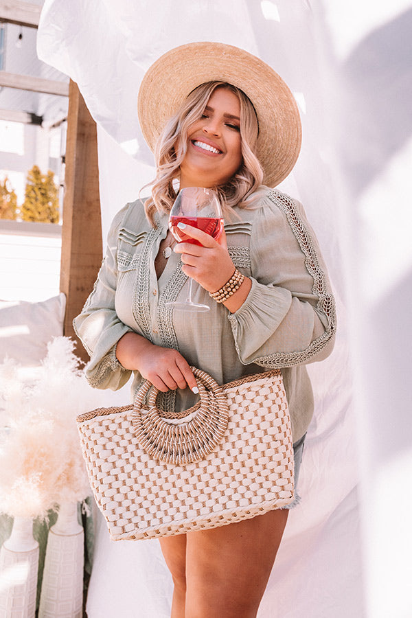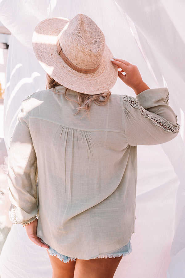 Plus Size - Keep your transitional style cordial with this cute pear colored top featuring lightweight flowy material with intricate crochet detailing throughout, a button up front with a rounded v-notch neckline, long bubble sleeves, and a relaxed silhouette that falls into a rounded hemline! Measurements