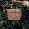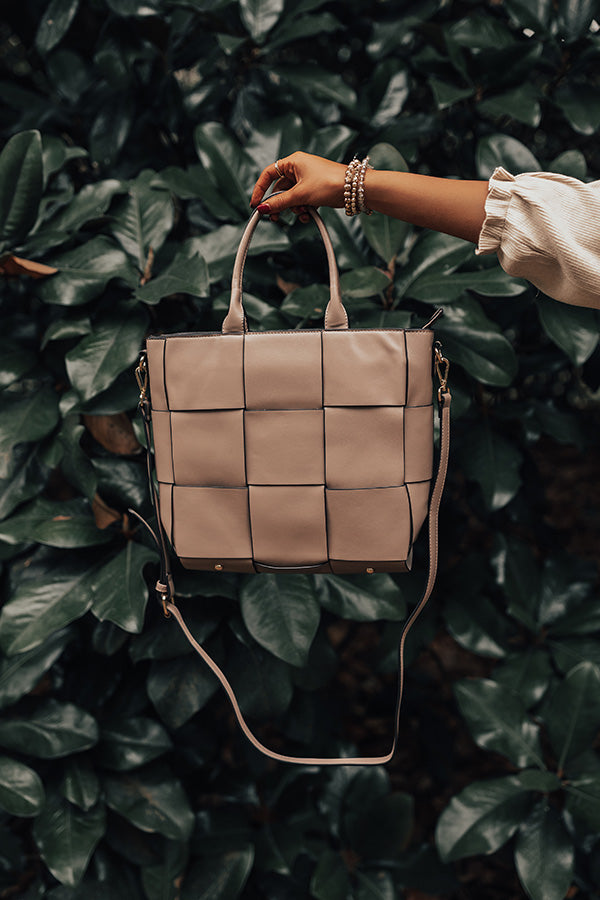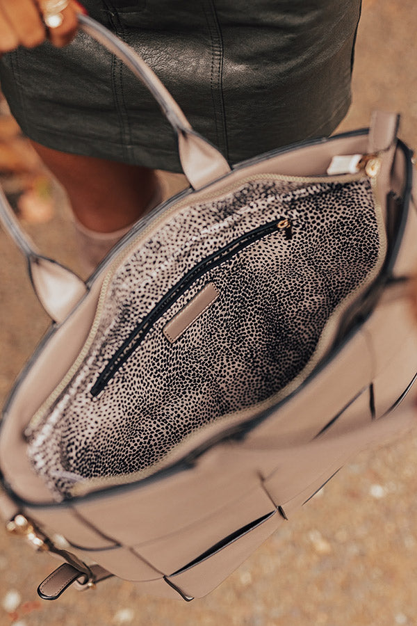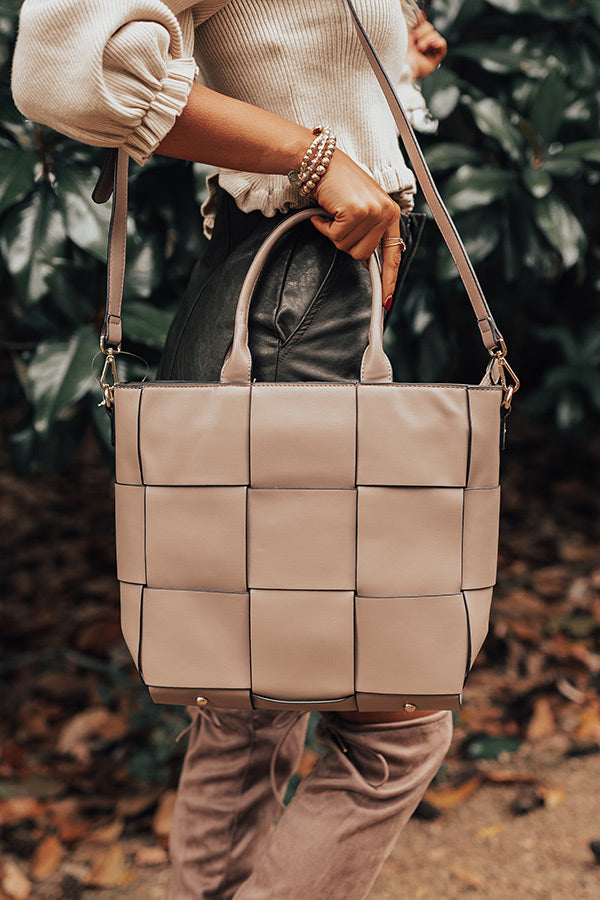 Keep your look high profile with this chic taupe colored tote featuring faux leather material with large woven texturing, two tote handles, a removable and adjustable shoulder strap, and a spacious fully lined interior with a zip closure and an additional inside zip closure pocket!