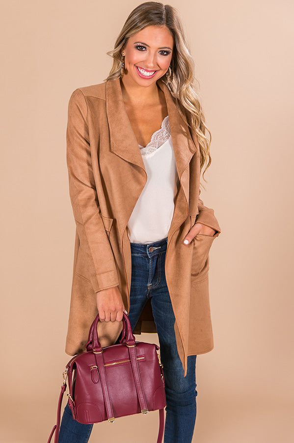 Add a sophisticated & stylish twist to any look with the "Keep Me Warm Faux Suede Coat!" This faux suede coat has the versatility to take you from nine to wine, with long sleeves & a collared neckline that falls into a lightweight open-front silhouette with oversized front pockets. Whether you are headed to work, or looking to add a little warmth to a dressy date night look, this coat has what it takes to add a posh & polished twist to any outfit.