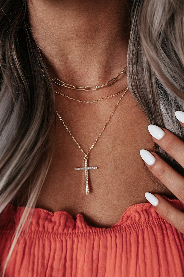 Add some subtle shine to you look with our adorable 'Keep Moving Layered Necklace' featuring three gold pieces: a large link choker, a medium length snake chain, and a longer dainty chain with a rhinestone cross!