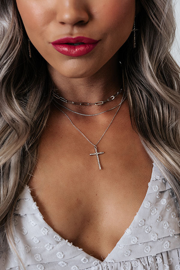 Add some subtle shine to you look with our adorable 'Keep Moving Layered Necklace' featuring three silver pieces: a large link choker, a medium length snake chain, and a longer dainty chain with a rhinestone cross!