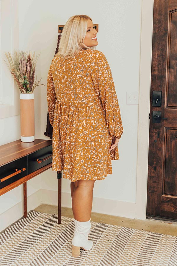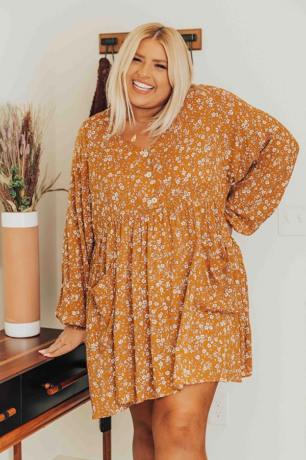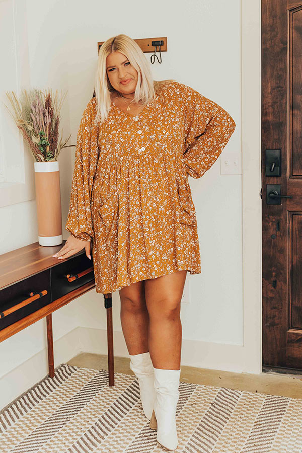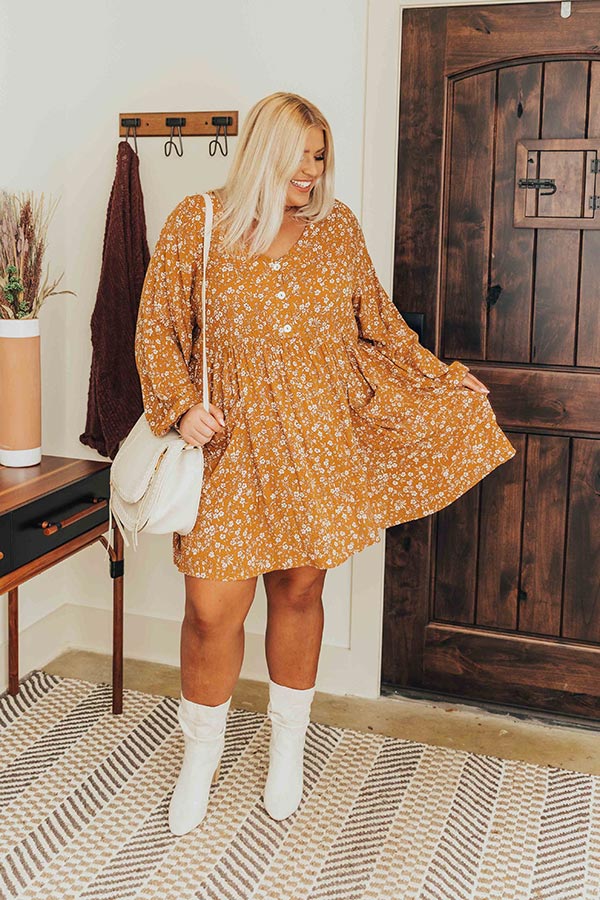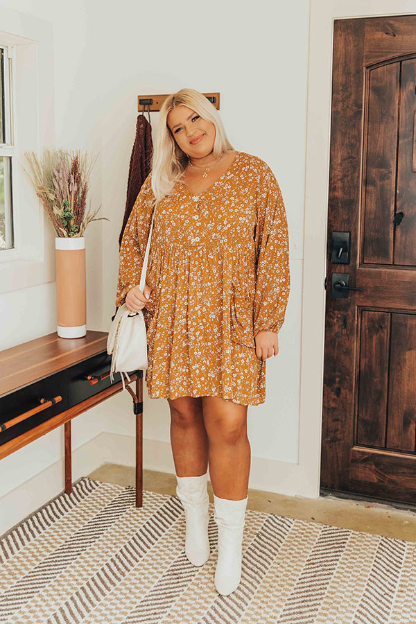 We have no doubt you won't be able to stop smiling when you wear this pretty plus size dark mustard colored shift dress featuring lightweight flowy material patterned with a small white floral print, a button up bodice with a v-cut neckline, long bubble sleeves, hidden front pockets, and a relaxed silhouette that falls into a straight mid-thigh length hemline!